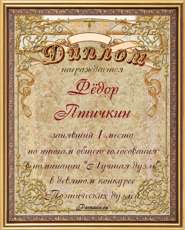 Диплом за 1-е место в номинации "Лучшая дуэль" по итогам общего голосования в девятом конкурсе поэтических дуэлей(№ 1.1)