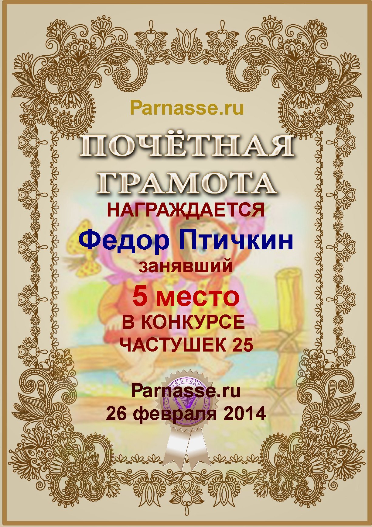 Похвальная грамота за 4 место и активное участие в конкурсе лимериков № 50+ (2.03.2014 г.)