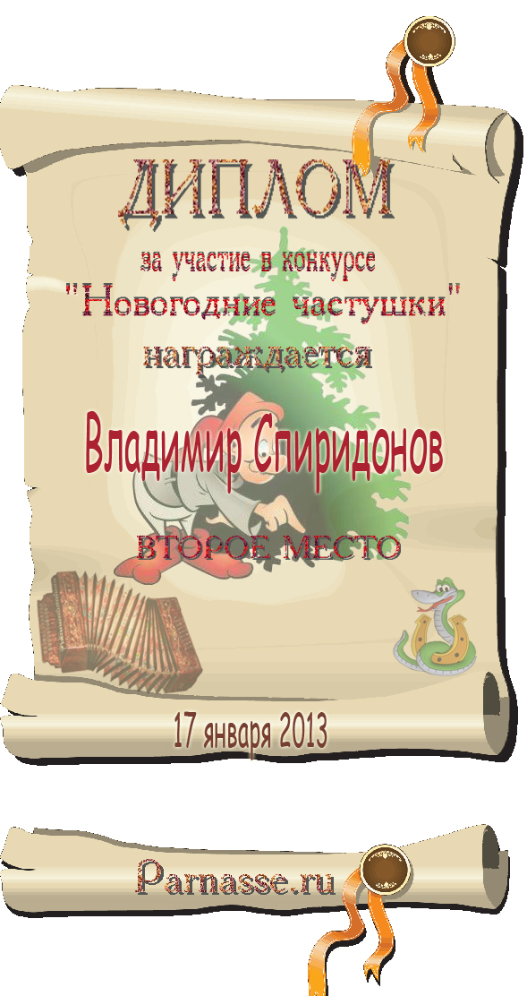 За третье место в новогоднем поздравительно-подарочном конкурсе "Украшаем Ёлочку". Поздравляем, Уважаемый Владимир, с прекраснейшей победой! Примите наши искренние поздравления! Счастья, удачи, благополучия!