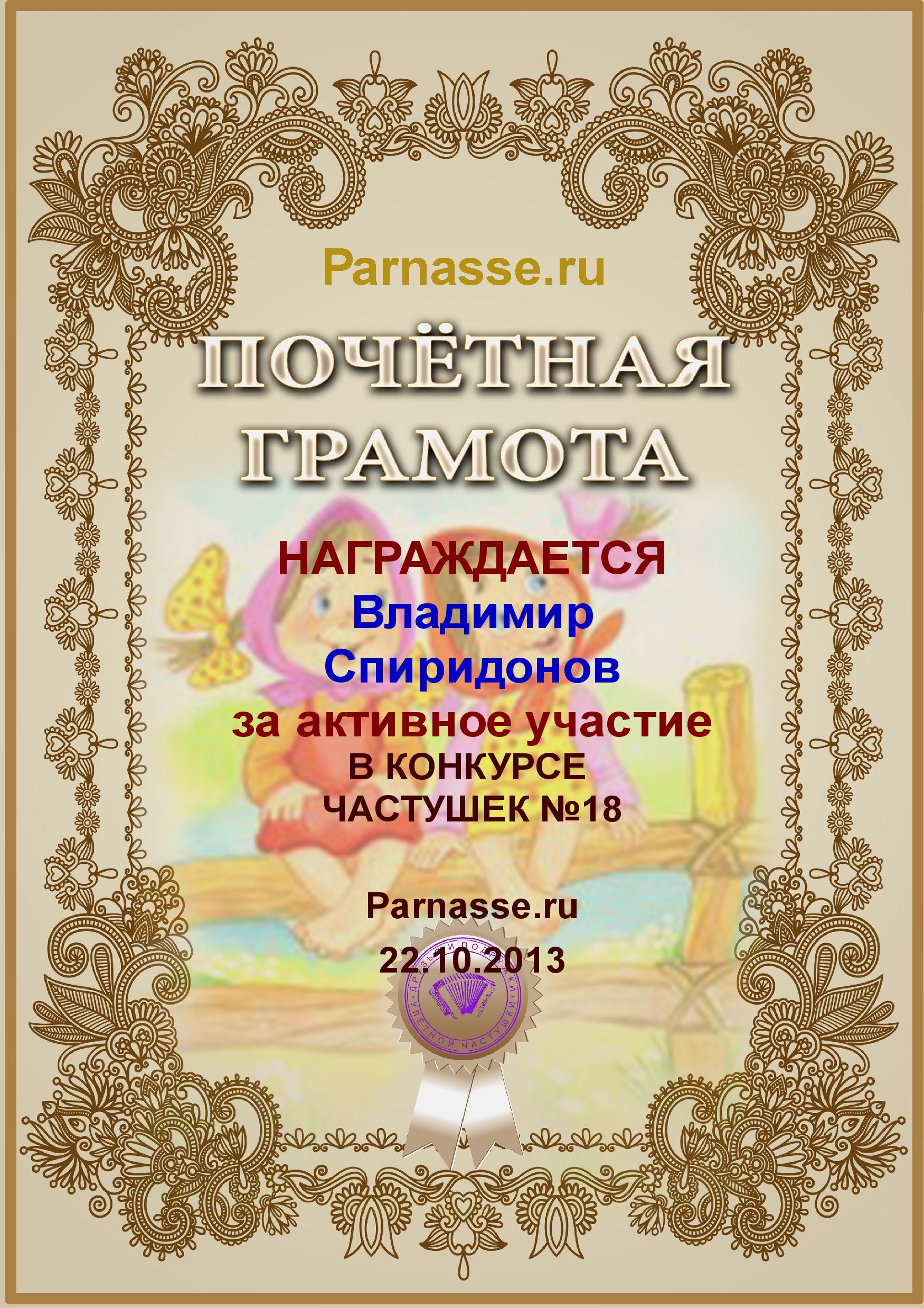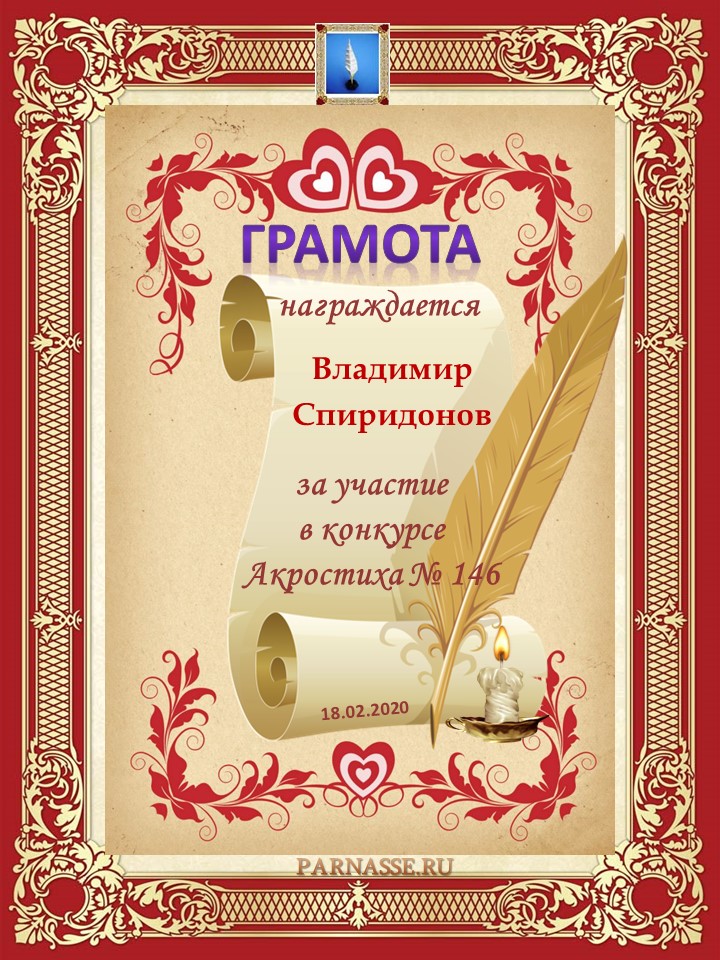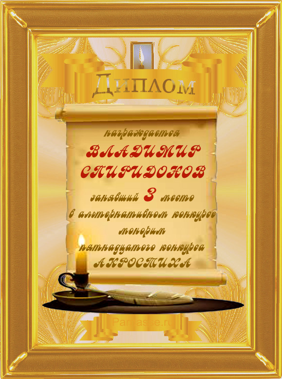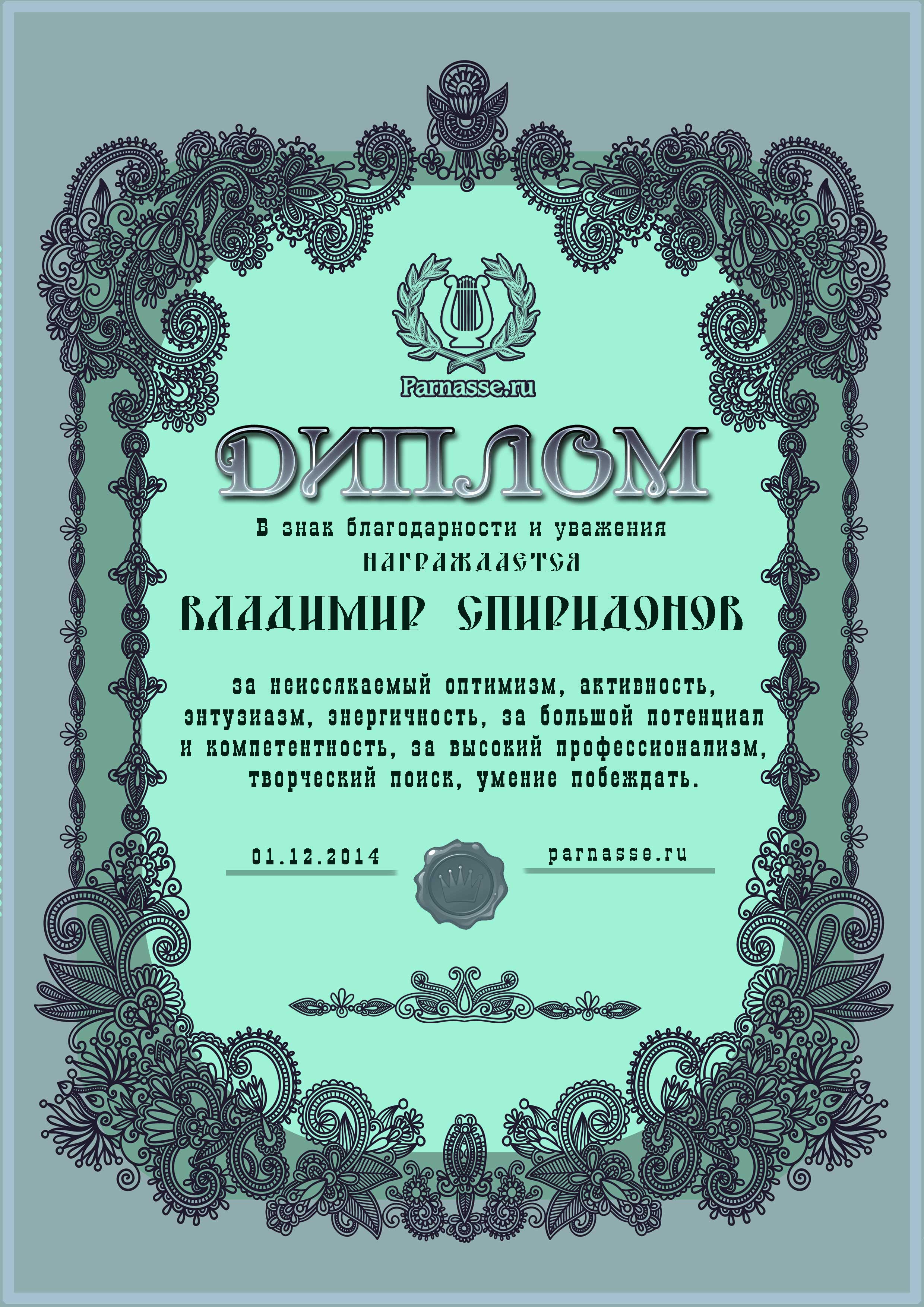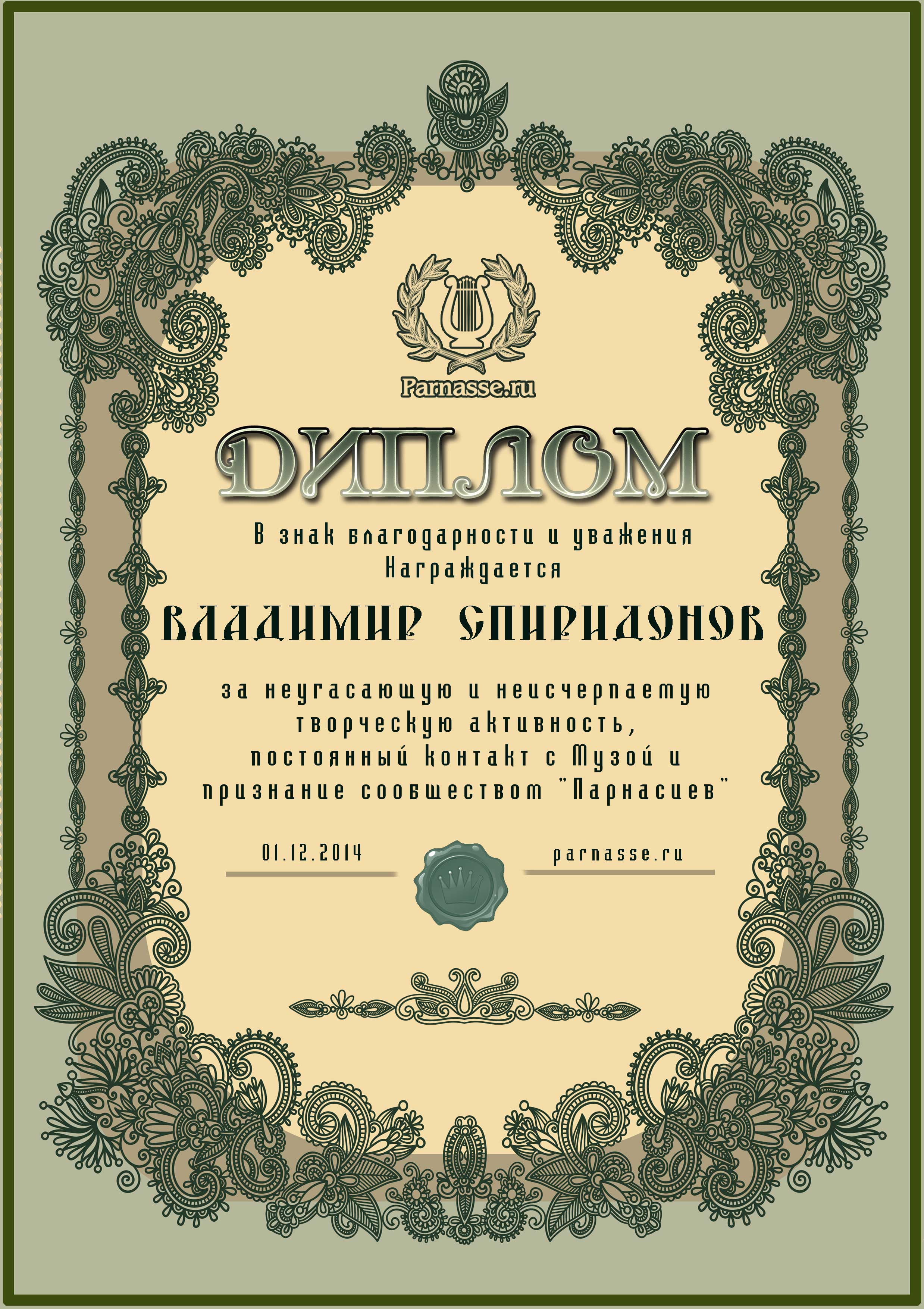 За неугасающую и неисчерпаемую творческую активность, постоянный контакт с Музой и признание сообществом "Парнасцев". От всей души желаем Вам, Владимир, здоровья, любви, успехов, благополучия, удачи и творческого вдохновения!С уважением, благодарностью и признательностью, Администрация.
