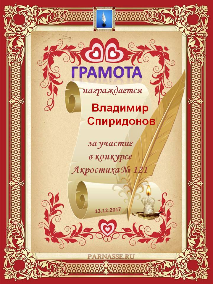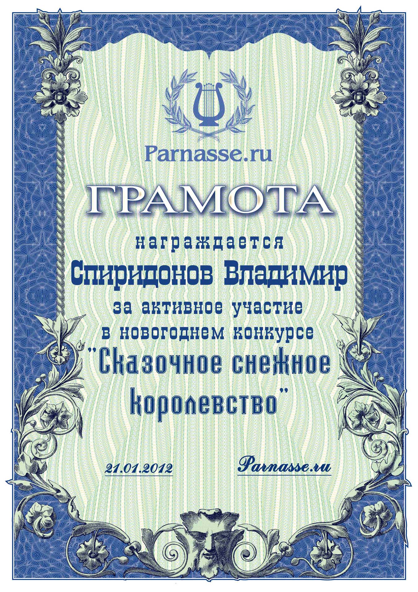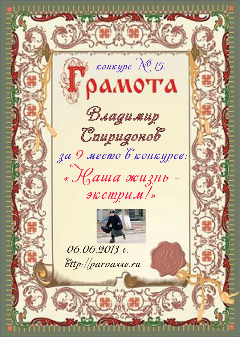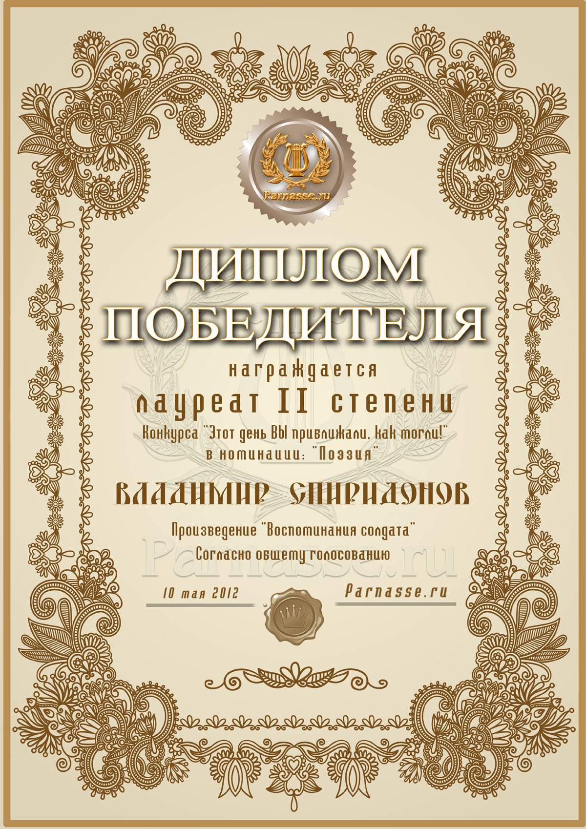 За неугасающую и неисчерпаемую творческую активность, постоянный контакт с Музой и признание сообществом "Парнасцев". От всей души желаем Вам, Владимир, здоровья, любви, успехов, благополучия, удачи и творческого вдохновения!С уважением, благодарностью и признательностью, Администрация.