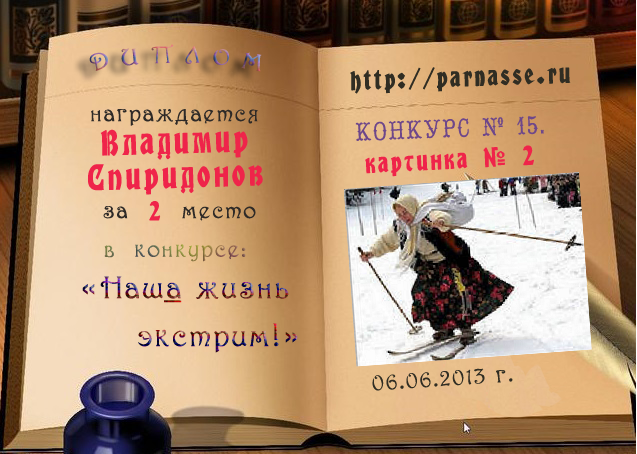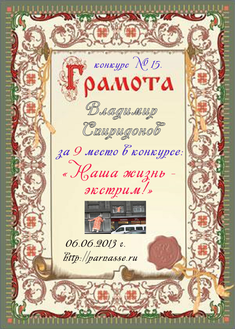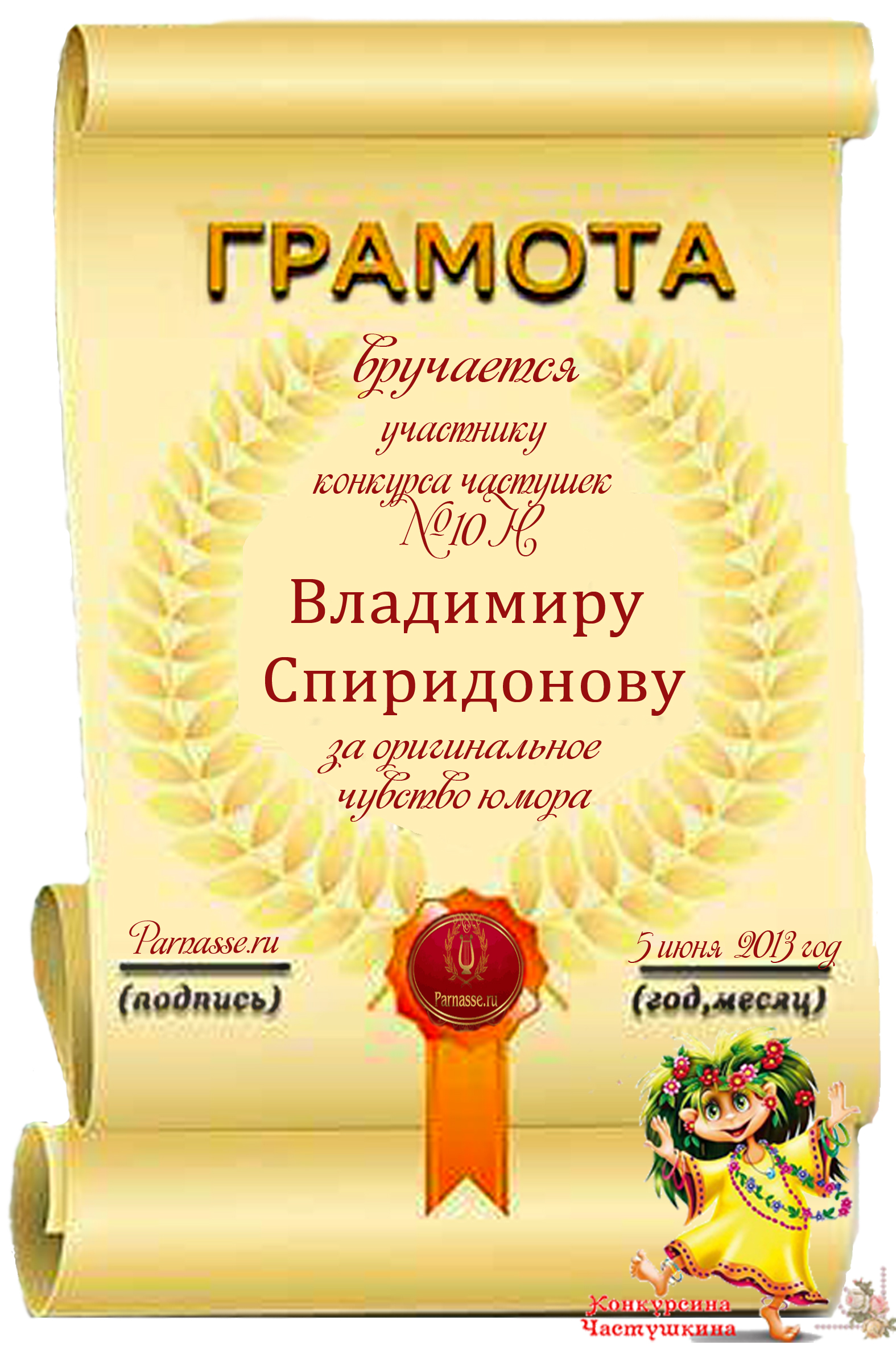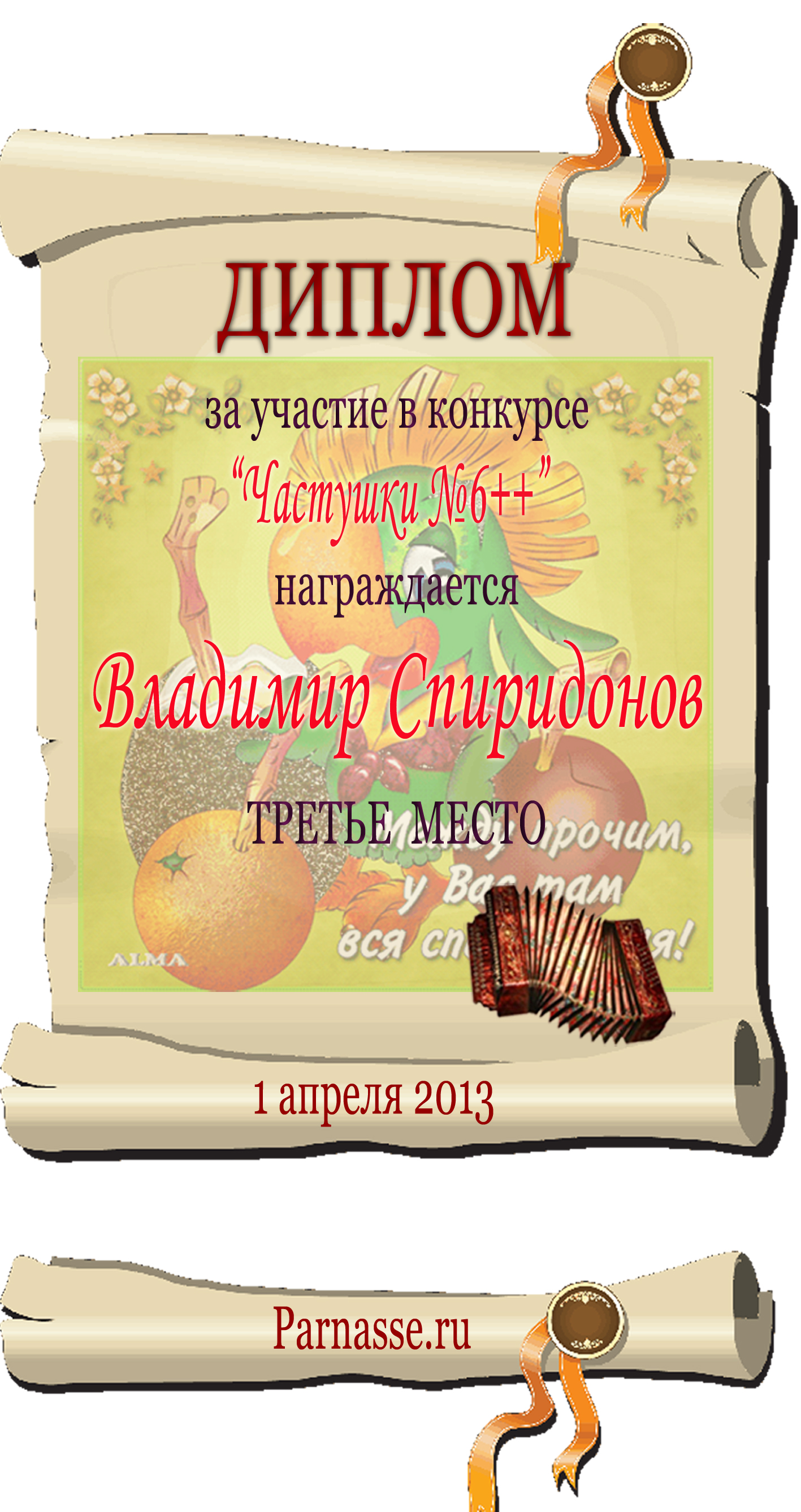Номинация "Самое необычное поздравление Парнаса с Днём Рождения"Хочется выразить Вам, Владимир, огромнейшую благодарность за неординарное яркое поздравление! Мы благодарны Вам за, то, что именно "Парнас" стал для Вас теплым и дружеским домом, кругом друзей, помощником в публикации своих замечательных произведений в Интернете!