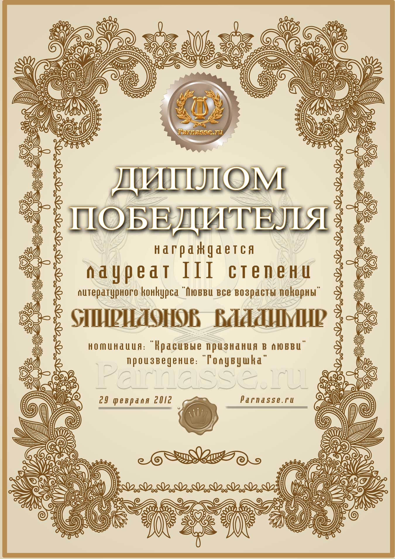 Диплом лауреата III степени лит.конкурса "Любви все возрасты покорны"