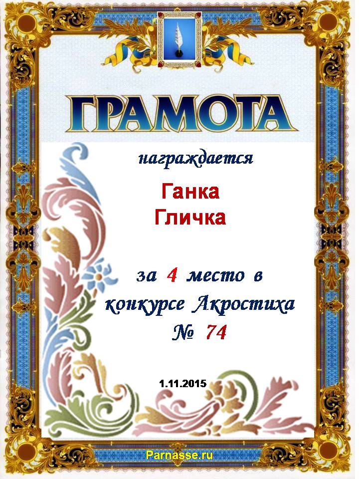 Грамота за 4 место в 105 конкурсе АКРОСТИХА (Альтернатива)! ПОЗДРАВЛЯЮ!