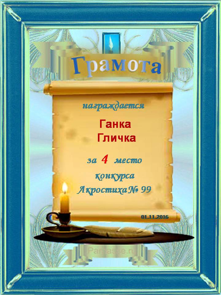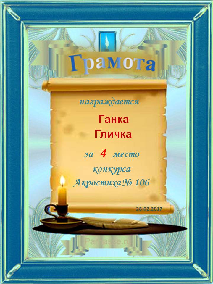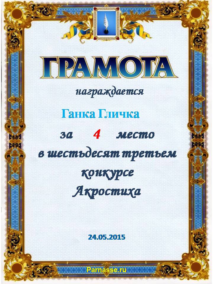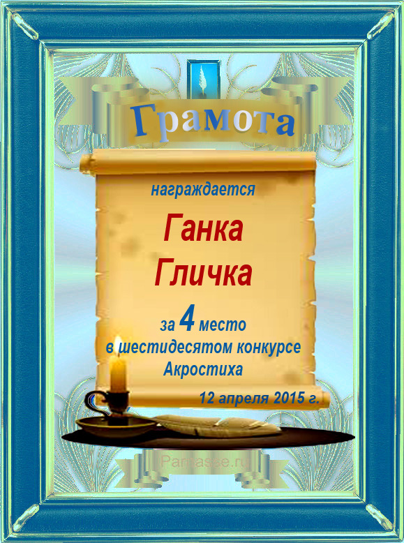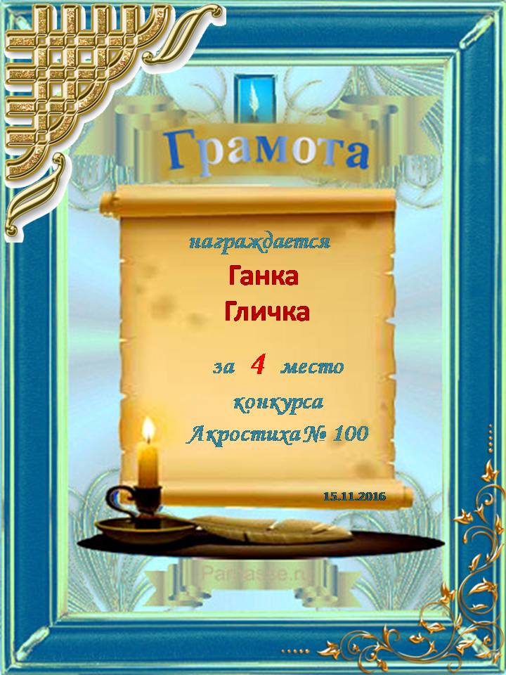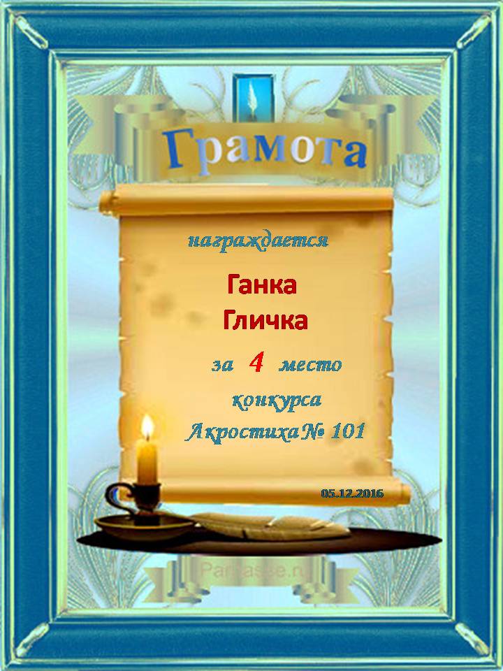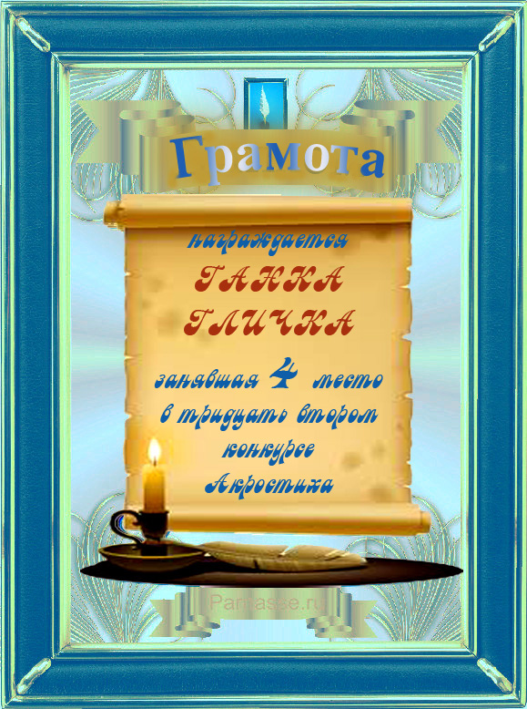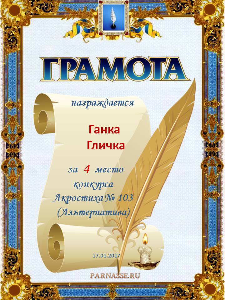 Грамота за 4 место в 103 конкурсе АКРОСТИХА (Альтернатива)! ПОЗДРАВЛЯЮ!