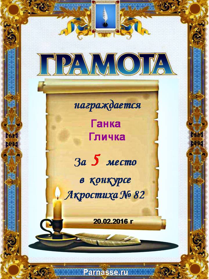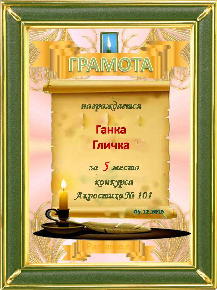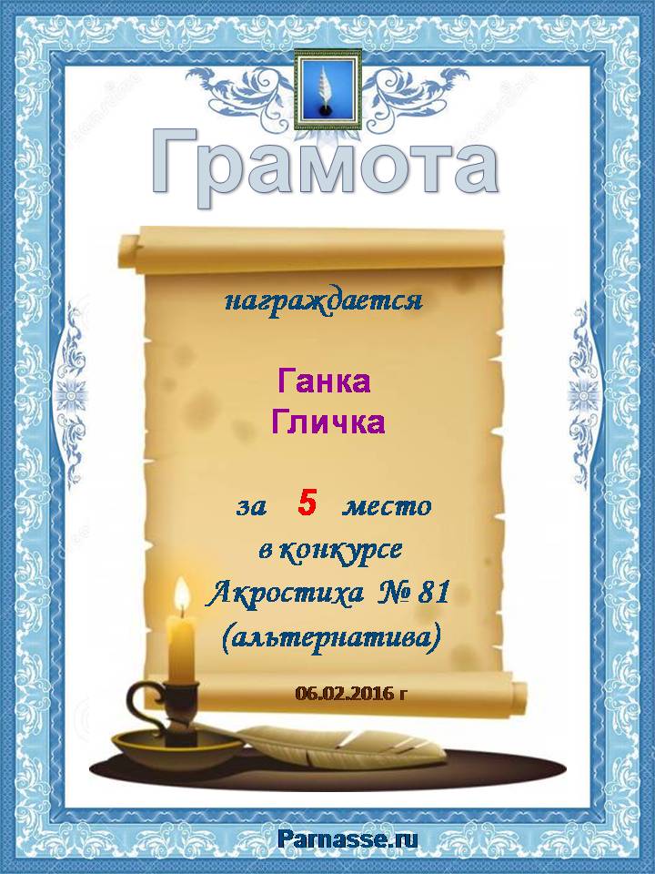 Грамота за 5 место в 106 конкурсе АКРОСТИХА (Альтернатива)! ПОЗДРАВЛЯЮ!