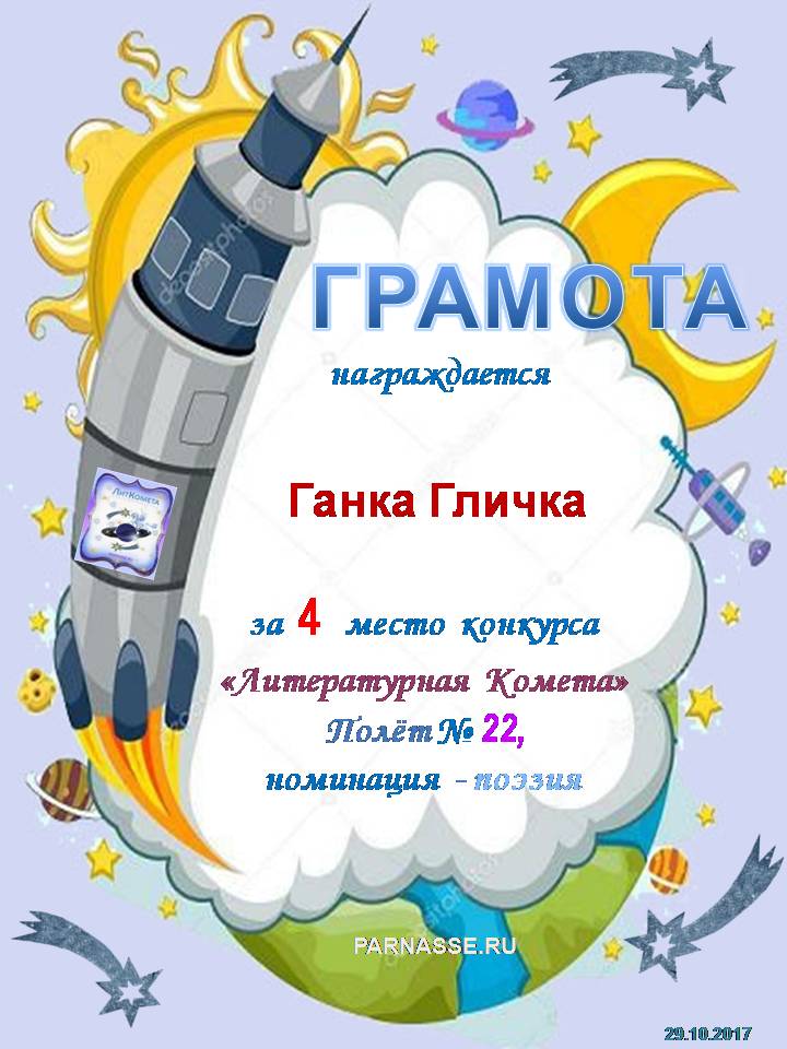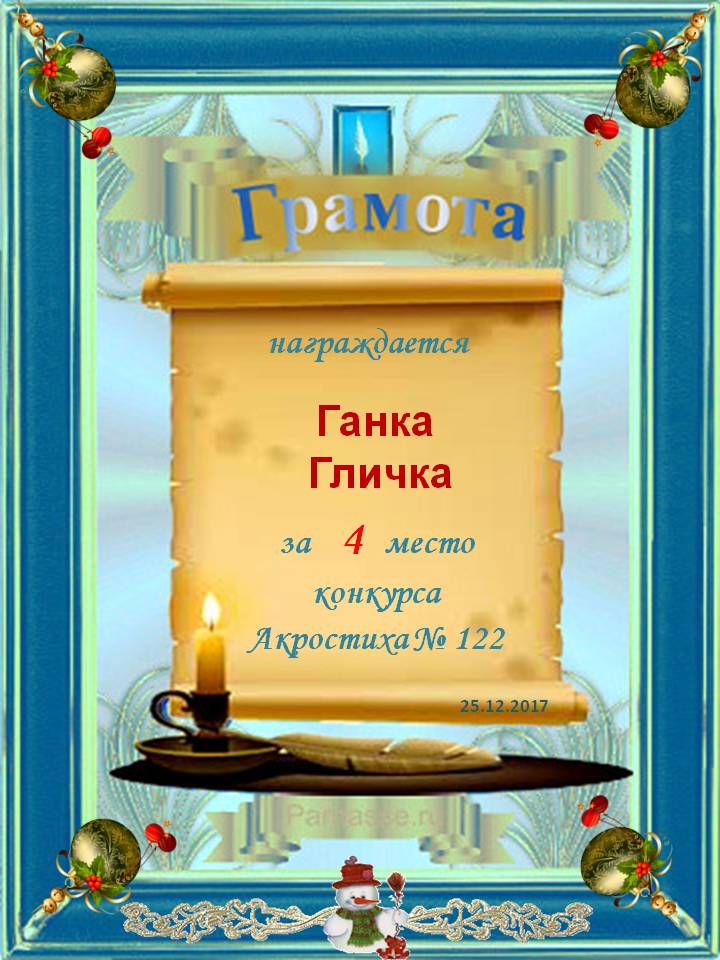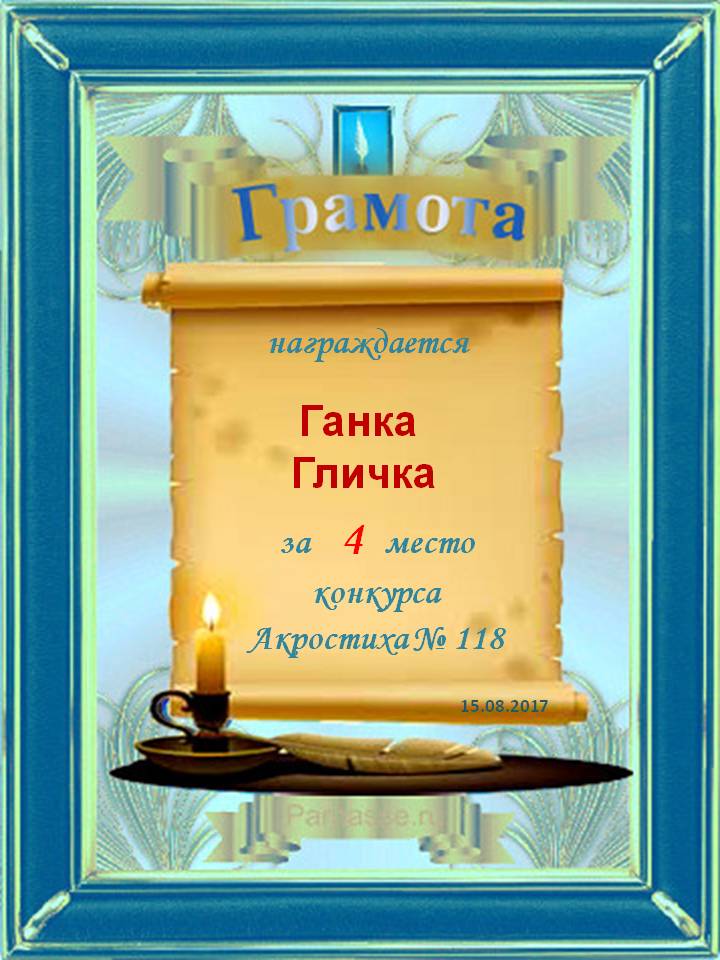 Грамота за 4 место в 118 конкурсе АКРОСТИХА (Альтернатива)! ПОЗДРАВЛЯЮ!