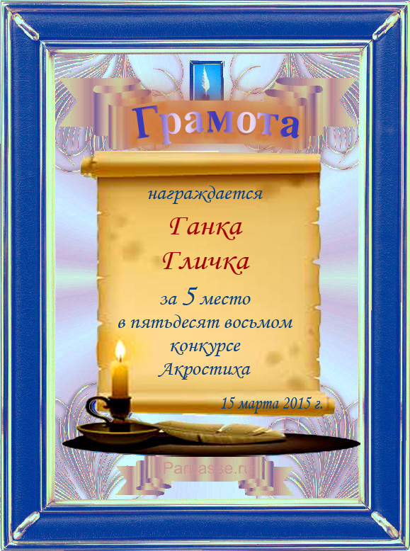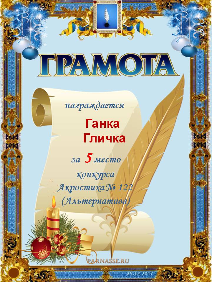 Грамота за 5 место в 122 конкурсе АКРОСТИХА (Альтернатива)! ПОЗДРАВЛЯЮ!
