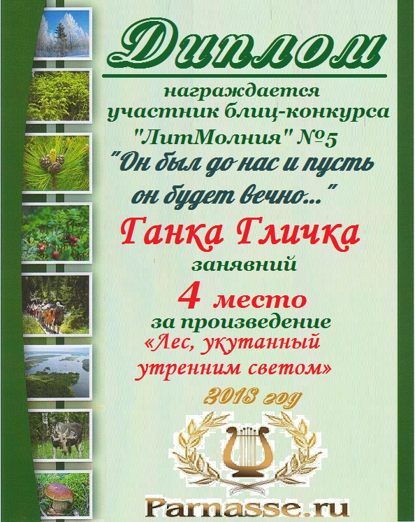 Четвёртое место в Блиц-Конкурсе "ЛитМолния" №5 «Он был до нас и пусть он будет вечно…» за произведение «Лес, укутанный утренним светом». Поздравляем!