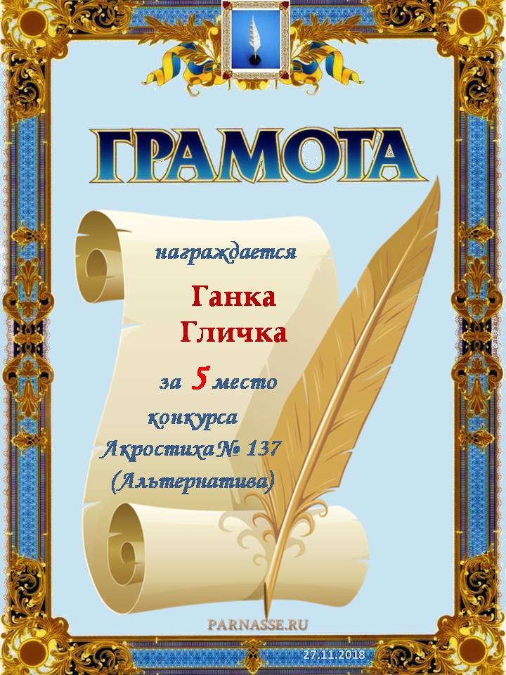 Грамота за 5 место в 138 конкурсе АКРОСТИХА (Альтернатива)! ПОЗДРАВЛЯЮ!