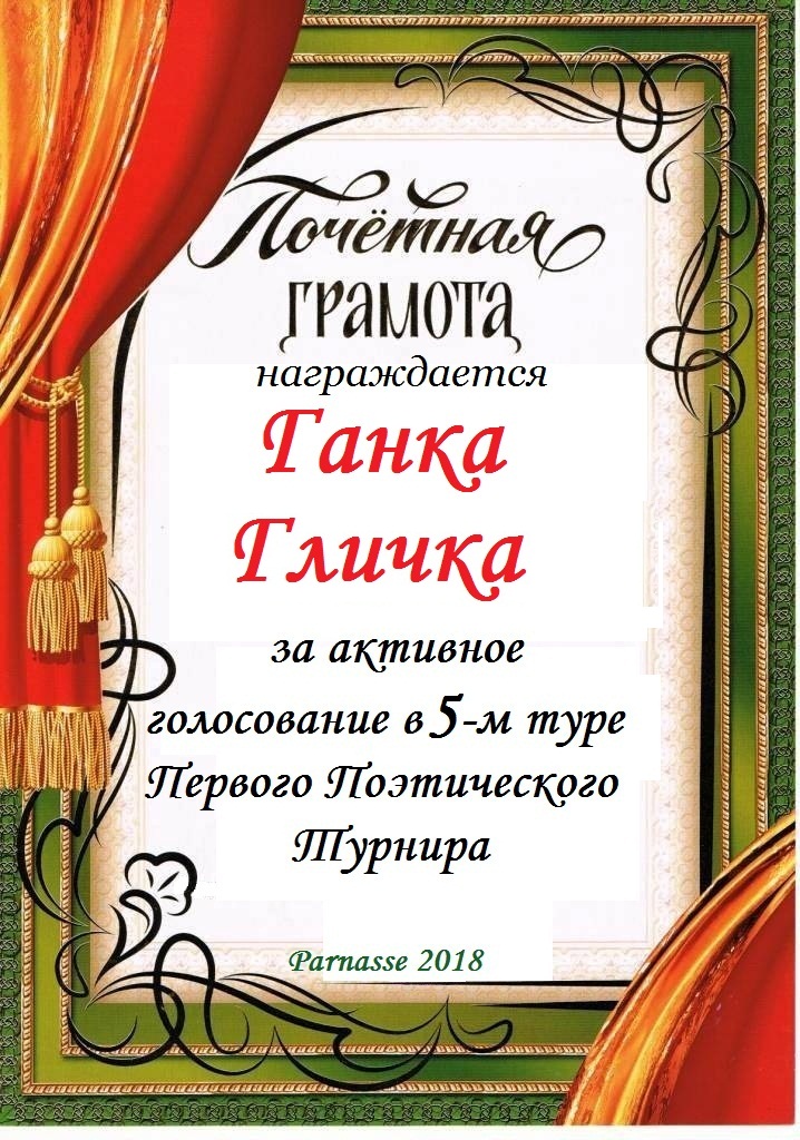 За активное участие в обсуждении конкурсных произведений 5-го тура Первого Поэтического Турнира «Наедине с бумагой и пером». Спасибо за поддержку!