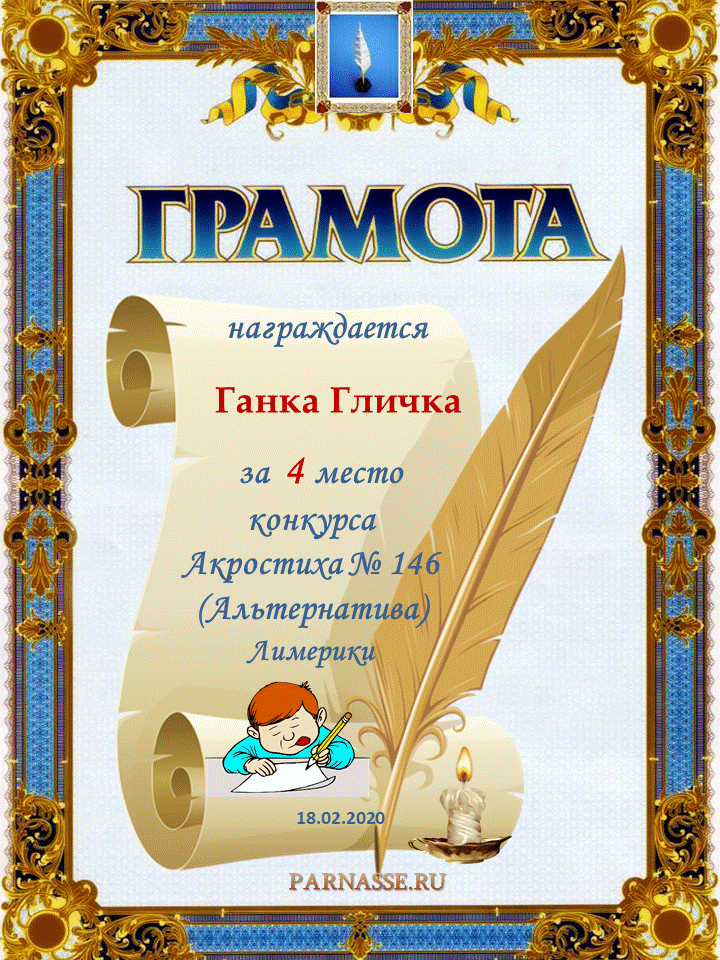 Грамота за 4 место в 146 конкурсе АКРОСТИХА (Альтернатива)! ПОЗДРАВЛЯЮ!