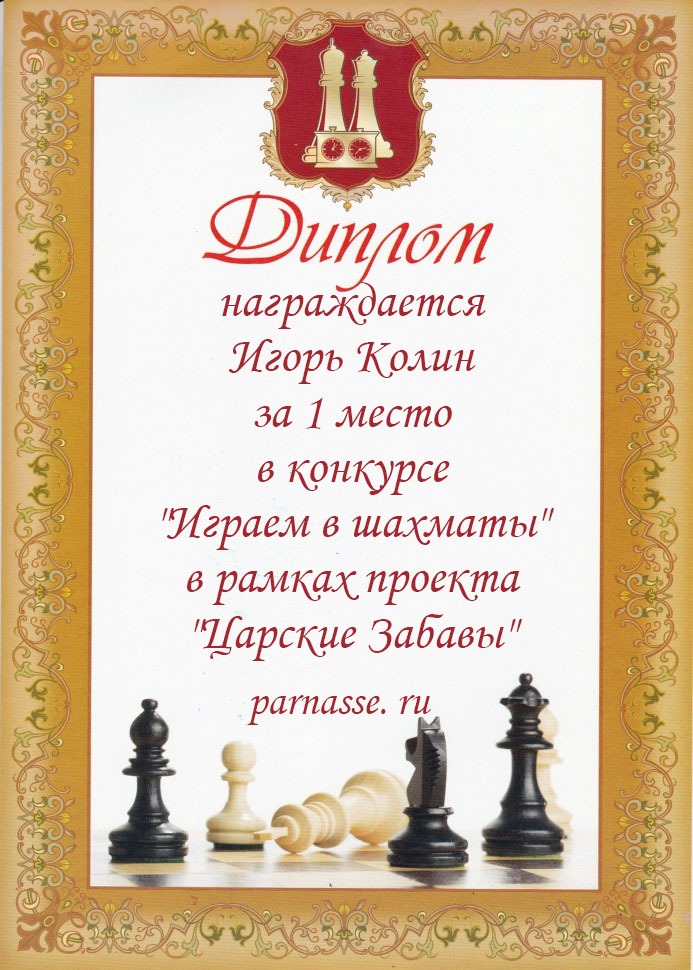 1 место в конкурсе "Играем в шахматы" в рамках проекта "Царские Забавы"