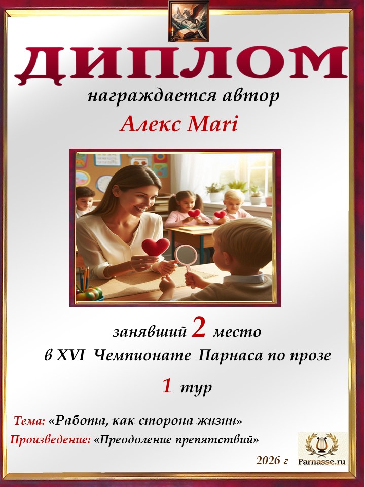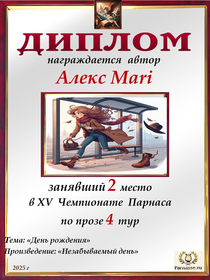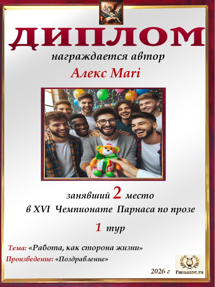 Поздравляю с занятым 2 местом в 10 туре XIII Чемпионата Парнаса по прозе! Спасибо за ожидание и понимание!
