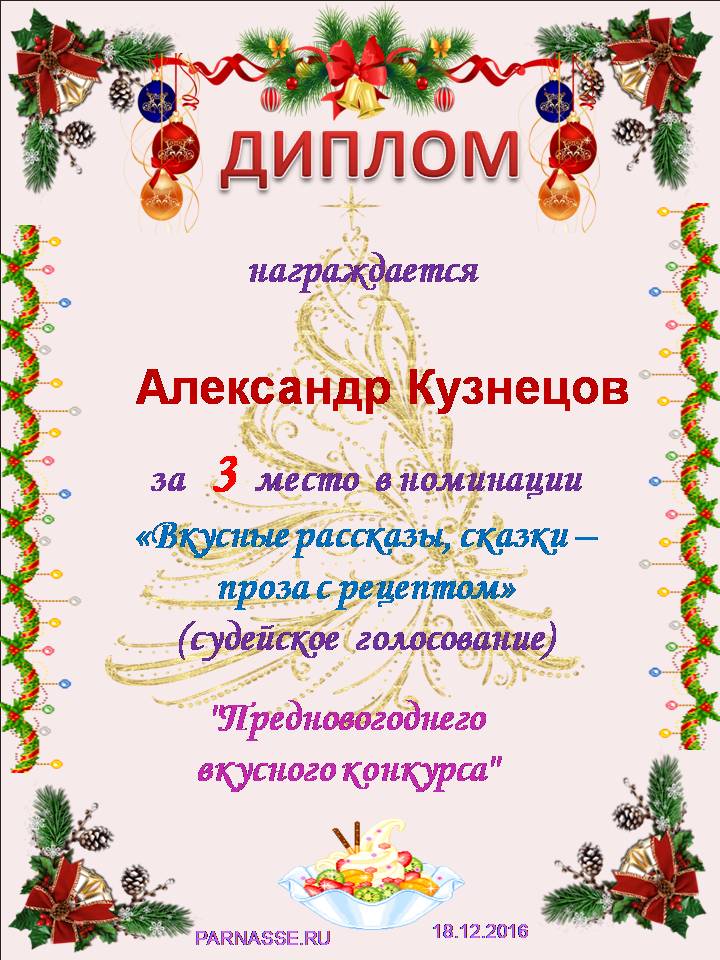 Третье место в музыкально-литературном конкурсе "Предновогодний Вкусный" в номинации "Вкусные рассказы, сказки - проза с рецептом", произведение "Год Петуха!", судейское голосование. Поздравляем с прекрасной победой. Счастья Вам, здоровья, удачи во всем, благополучия и вдохновения. Новых замечательных произведений.