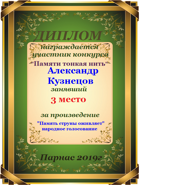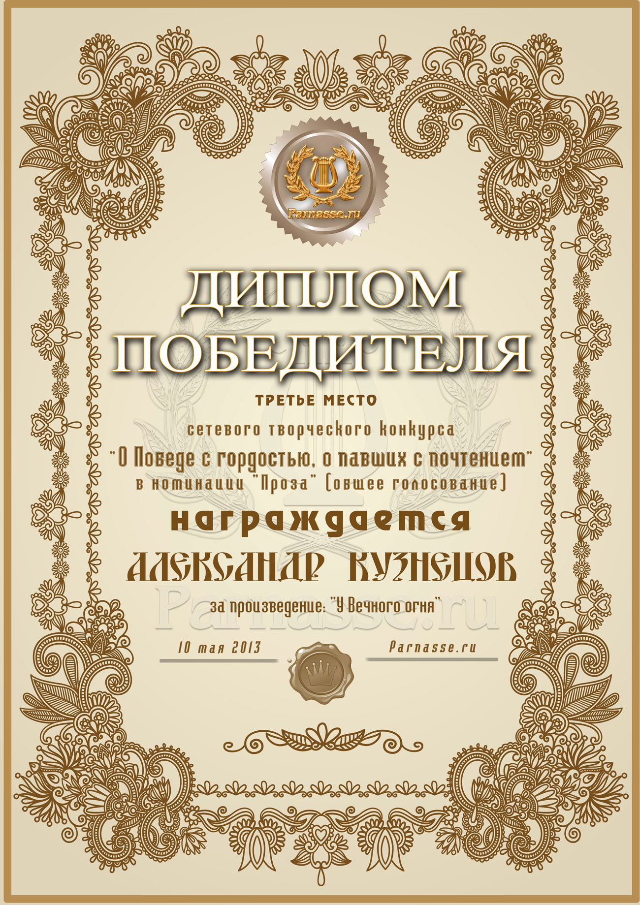 Третье место в музыкально-литературном конкурсе «О Победе с гордостью, о павших – с почтением!» Общее голосование. Номинация в прозе «Солдаты Великой Победы»! Произведение «У Вечного огня»! Поздравляем с красивой победой!