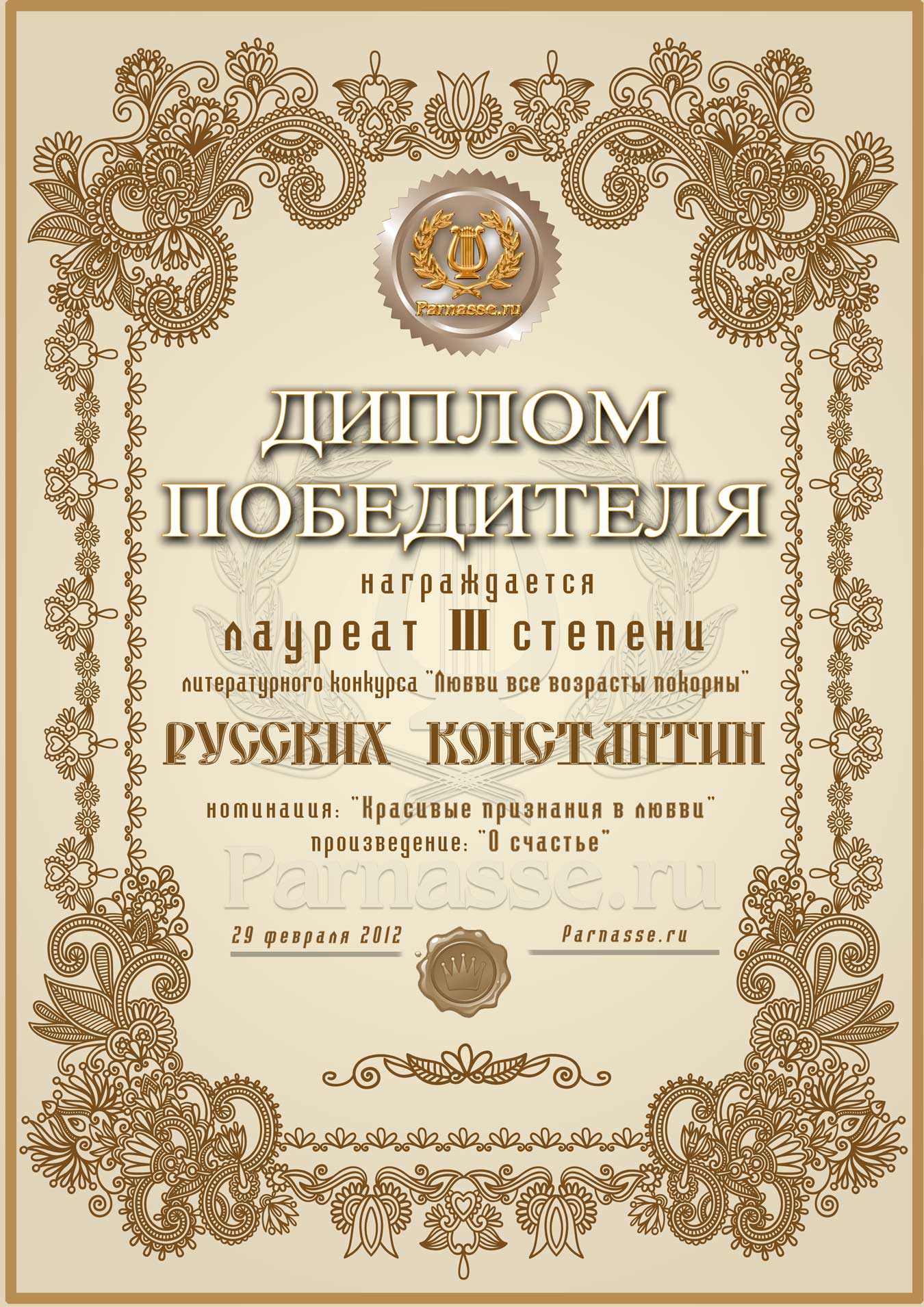 ![]() ![]() ![]() Лауреат III степени литературного конкурса «Любви все возрасты покорны»!