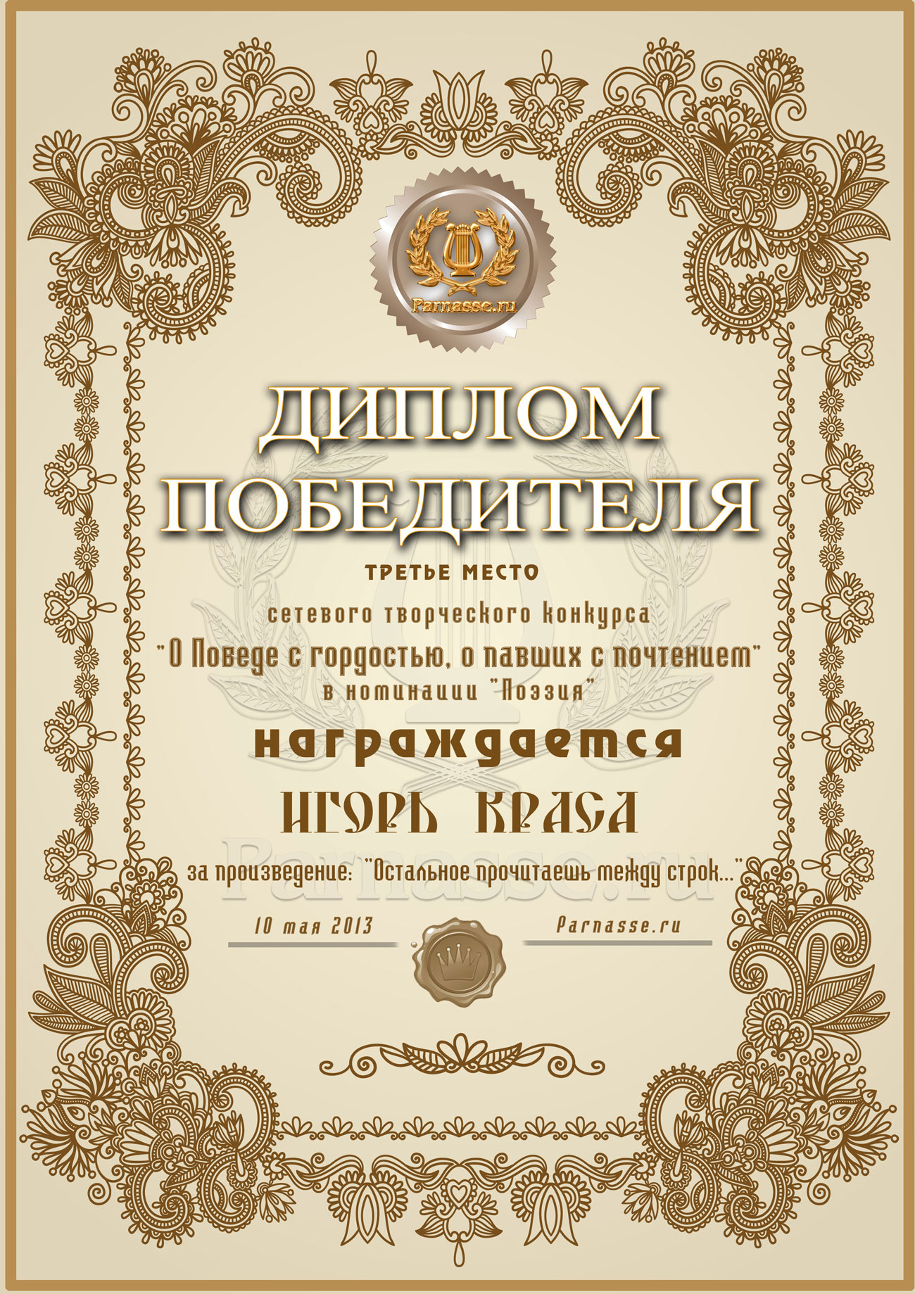 Третье место в музыкально-литературном конкурсе «О Победе с гордостью, о павших – с почтением!» Судейское голосование. Номинация в поэзии «Синий платочек»! Произведение «Остальное прочитаешь между строк»! Поздравляем с блестящей победой!