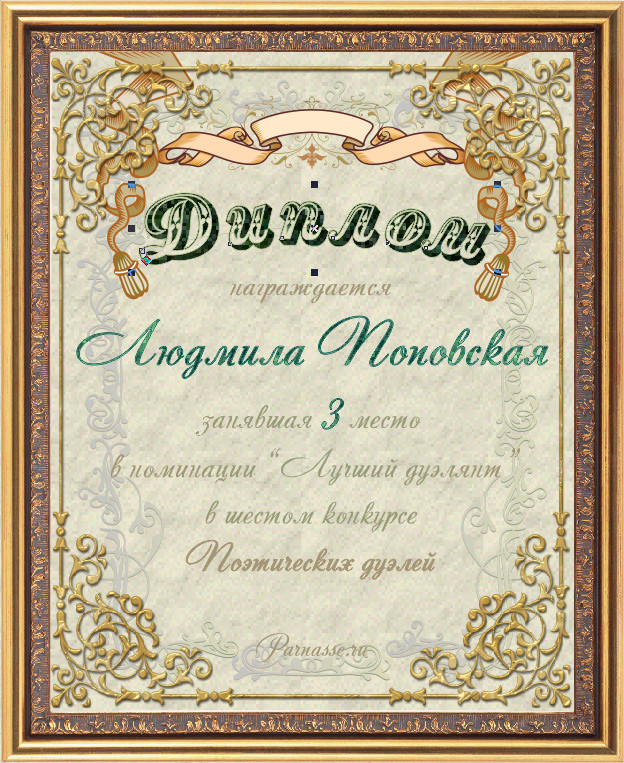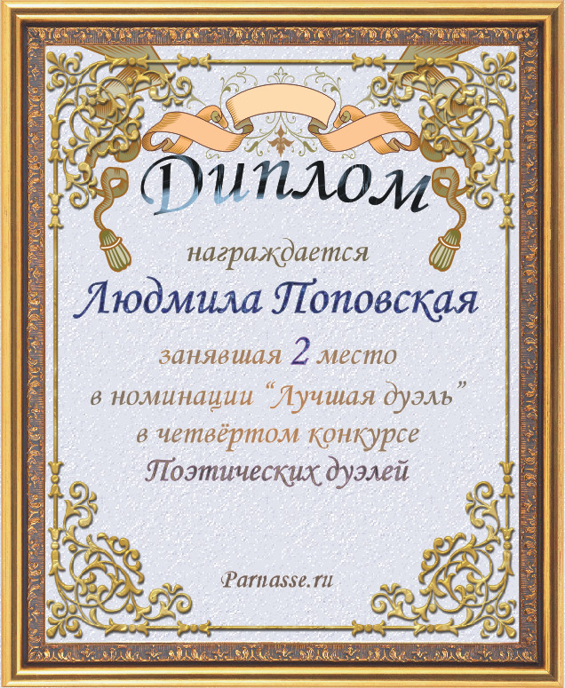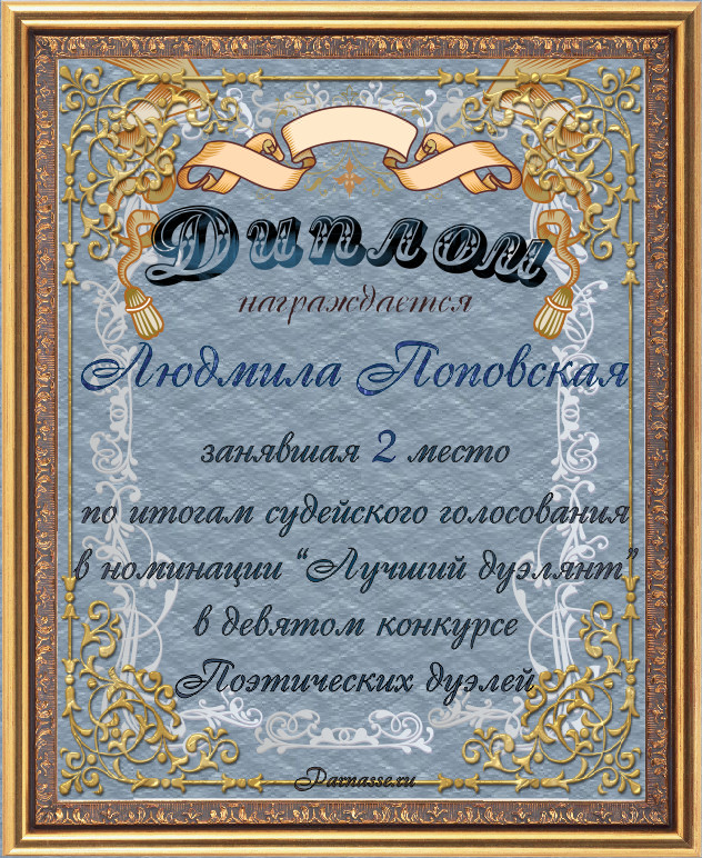 Диплом за 2-е место в номинации "Лучшая дуэль" по итогам судейского голосования в девятом конкурсе поэтических дуэлей(№ 15.1)