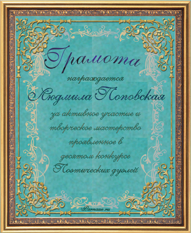 Диплом присуждён в номинации "Самый активный дуэлянт" девятого конкурса поэтических дуэлей
