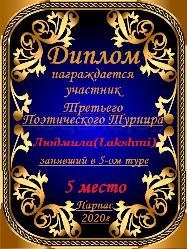 Пятое место в 5-м туре Третьего Поэтического Турнира " Я тебе подарю…" за произведение «Твой поцелуй прощальный». Поздравляем!