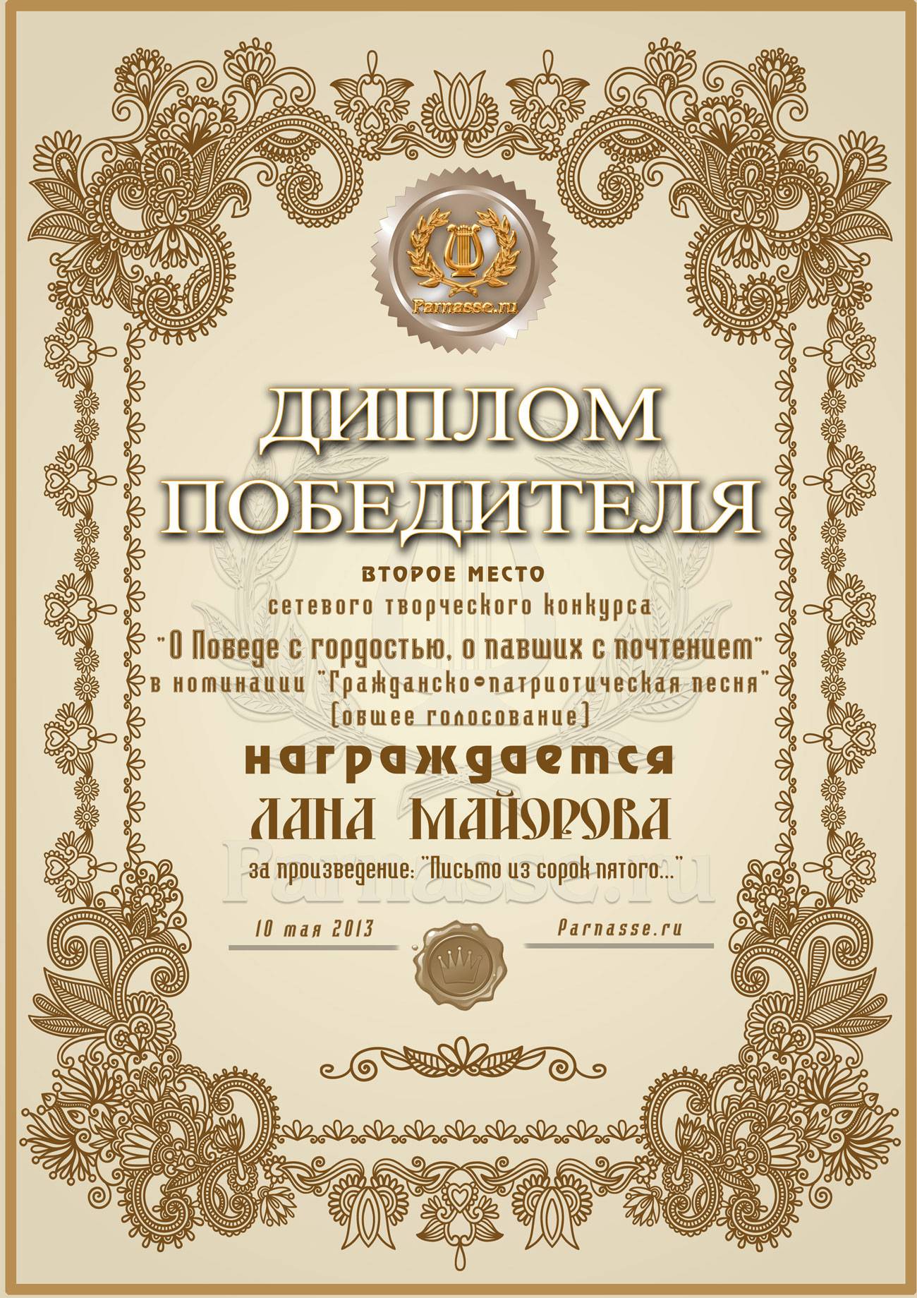 Второе место в музыкально-литературном конкурсе «О Победе с гордостью, о павших – с почтением!» Общее голосование. Номинация «Песня гражданско-патриотической тематики»! Автору видео песни «ПИСЬМО ИЗ СОРОК ПЯТОГО»! Поздравляем с блестящей Победой в конкурсе!