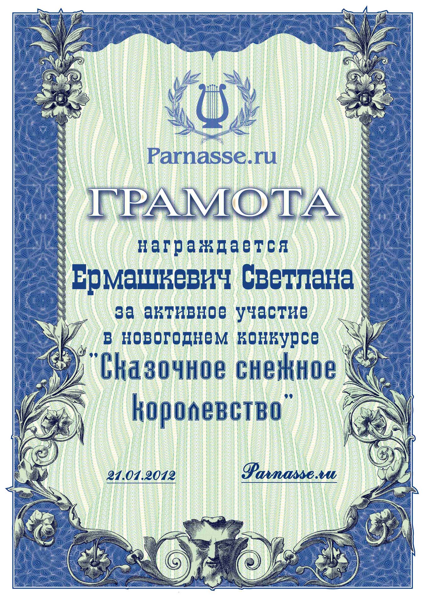 От лица Администрации творческого портала "Парнас" вручаем Вам этот памятный знак с самыми наилучшими пожеланиями! Пусть Вас весь год не покидает творческий запал, удача, а здоровье будет столь же крепким и нерушимым, как и традиция Новогоднего праздника! Счастья, успехов и любви Вам и Вашей семье, друзьям и близким!