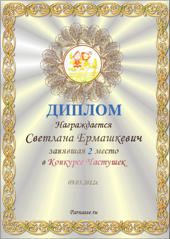 ![]() Медаль за ВТОРОЕ место во 2-ом конкурсе Частушек!