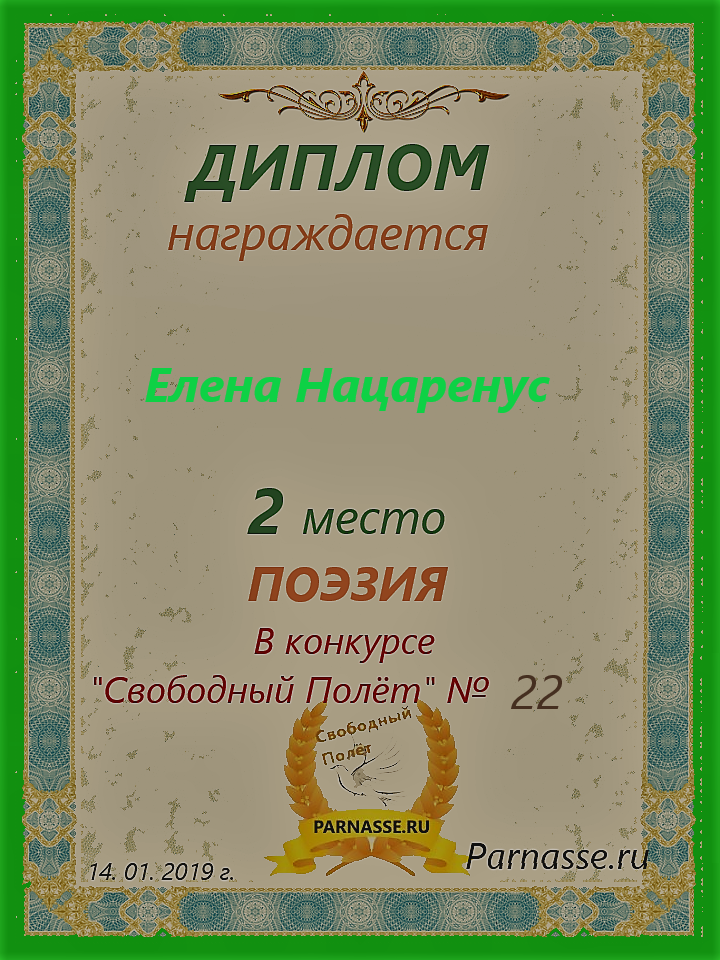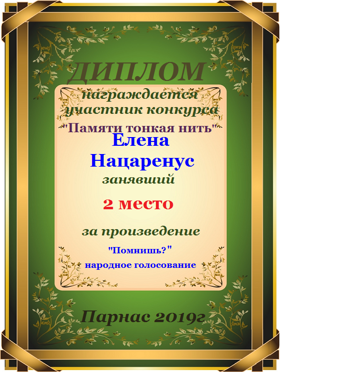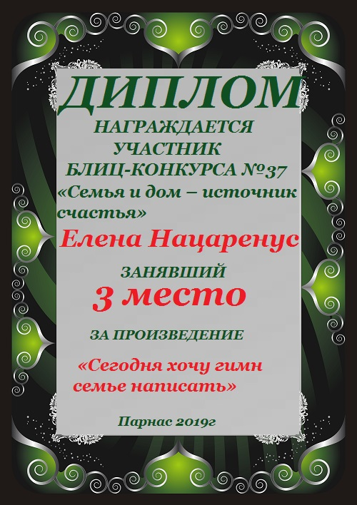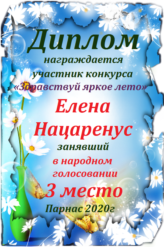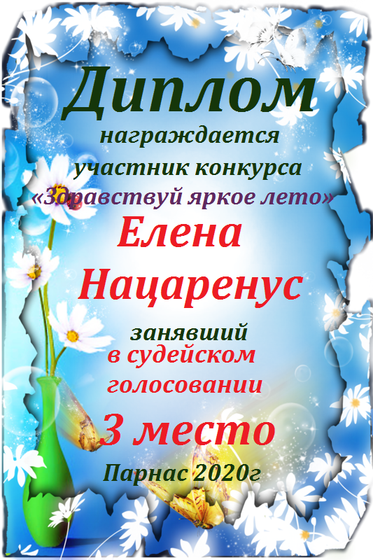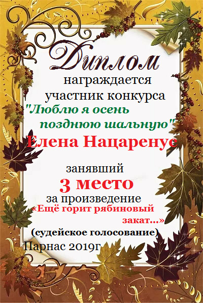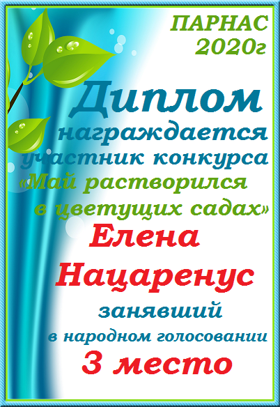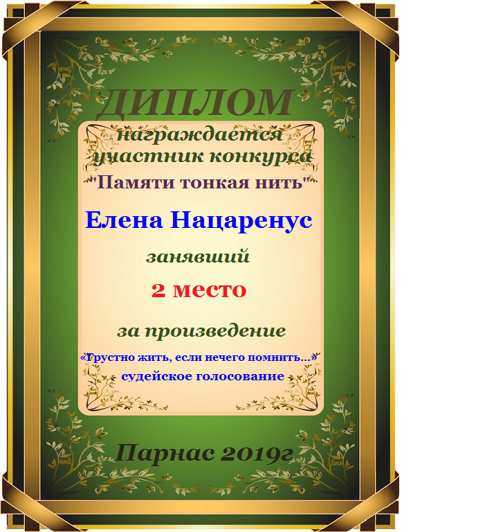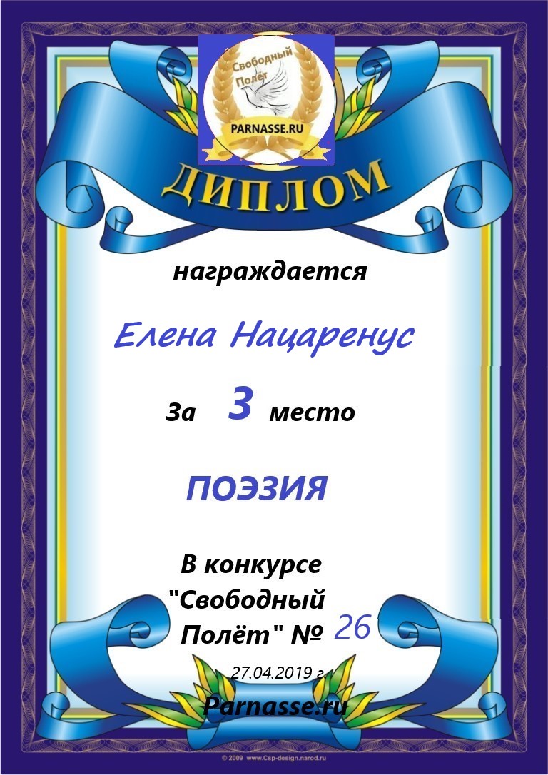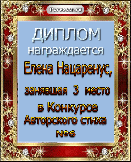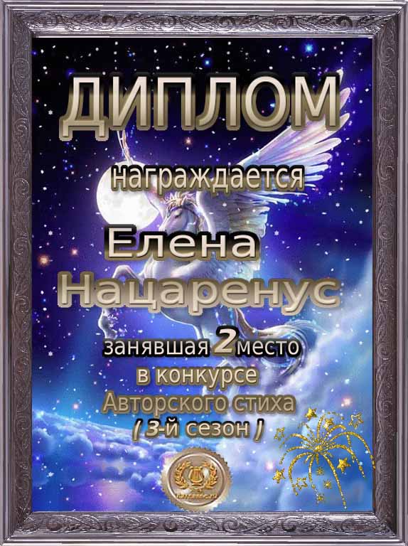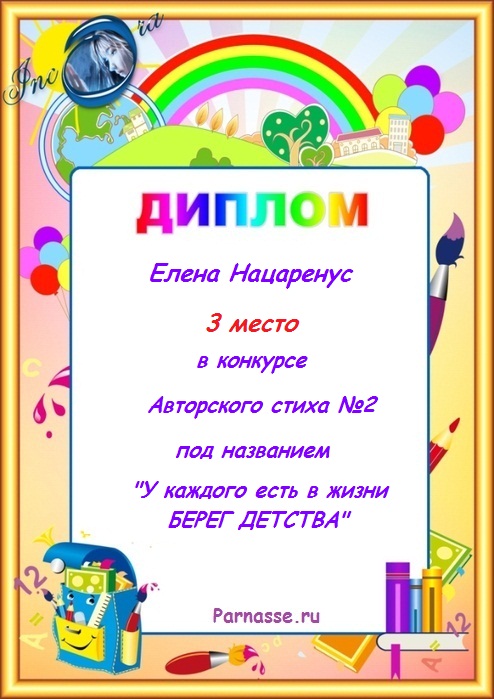 Диплом за 3 место в конкурсе авторского стиха №2 под названием "У каждого есть в жизни Берег Детства".ПОЗДРАВЛЯЕМ!