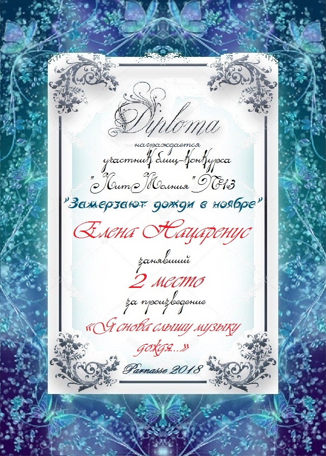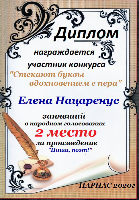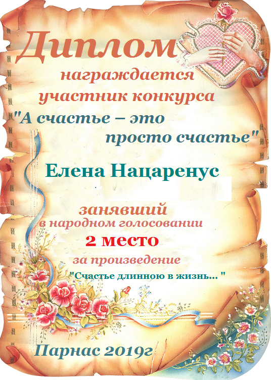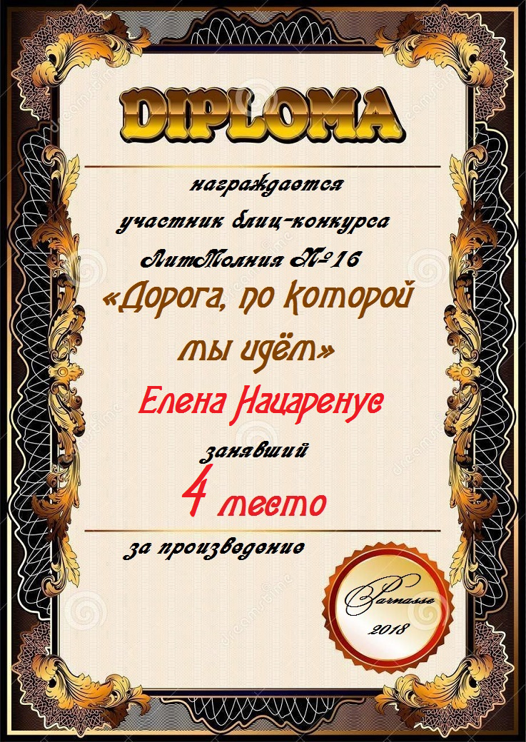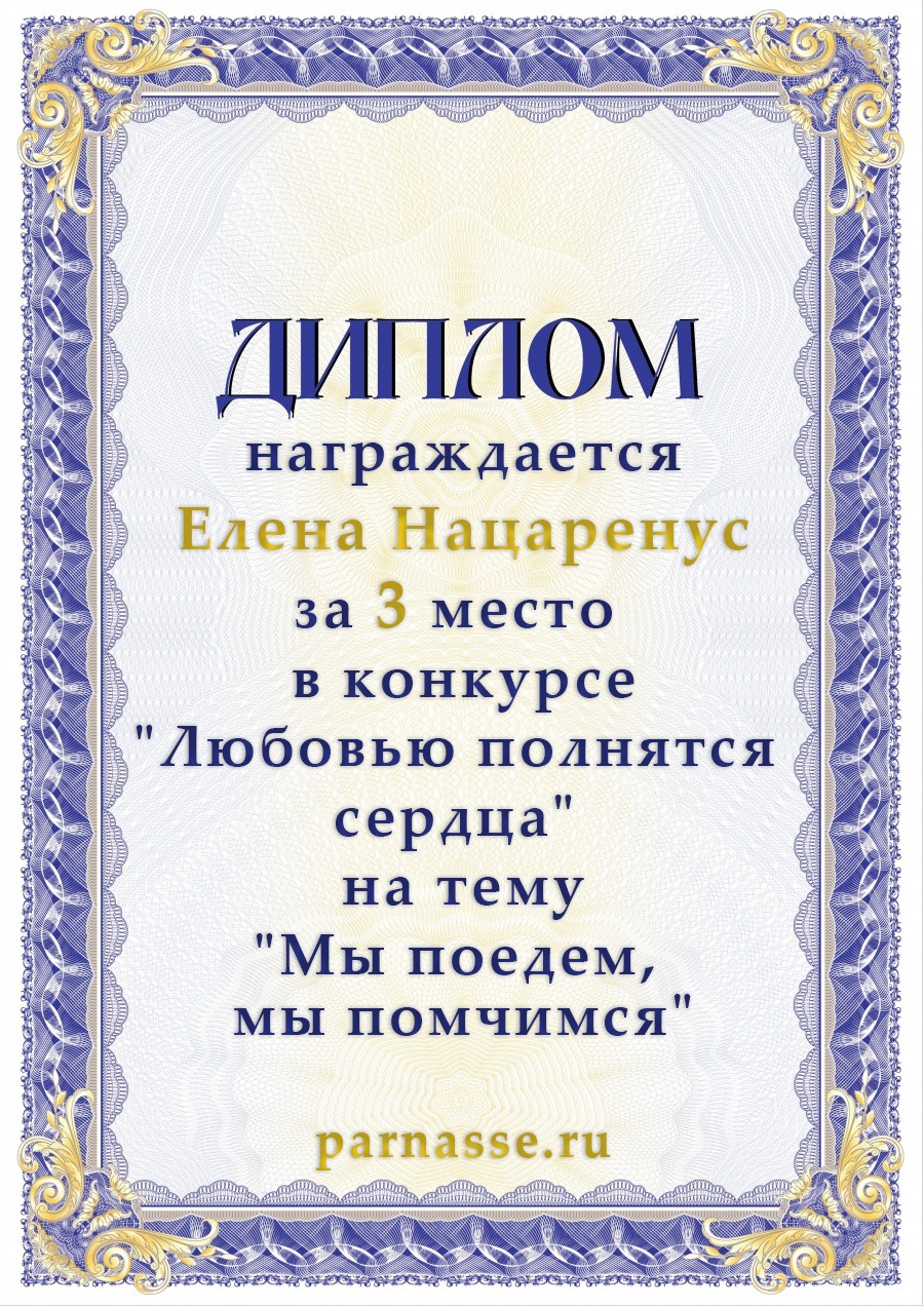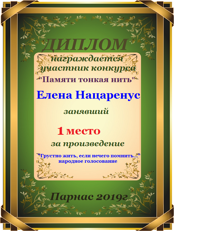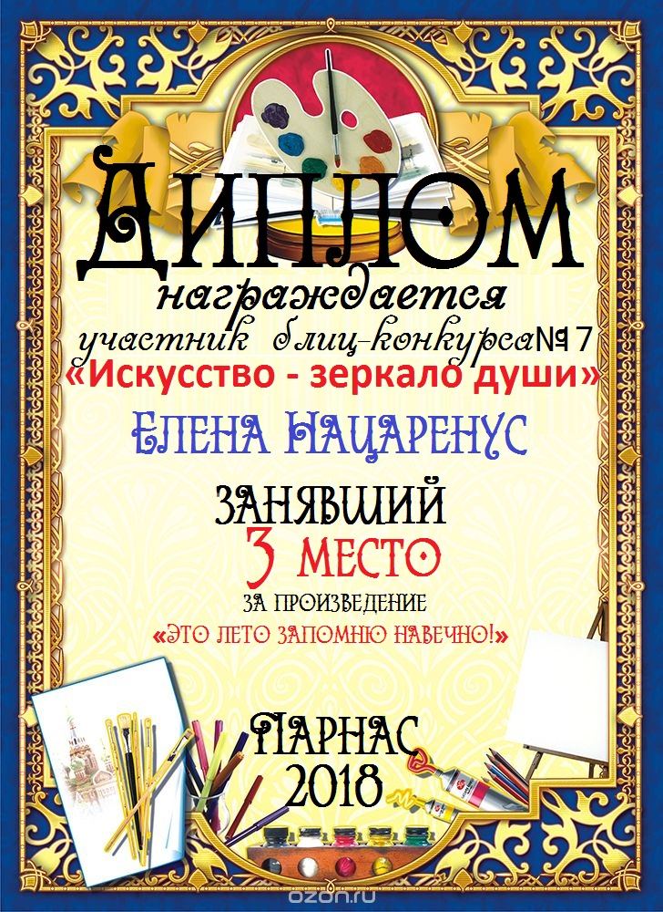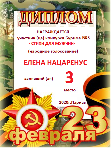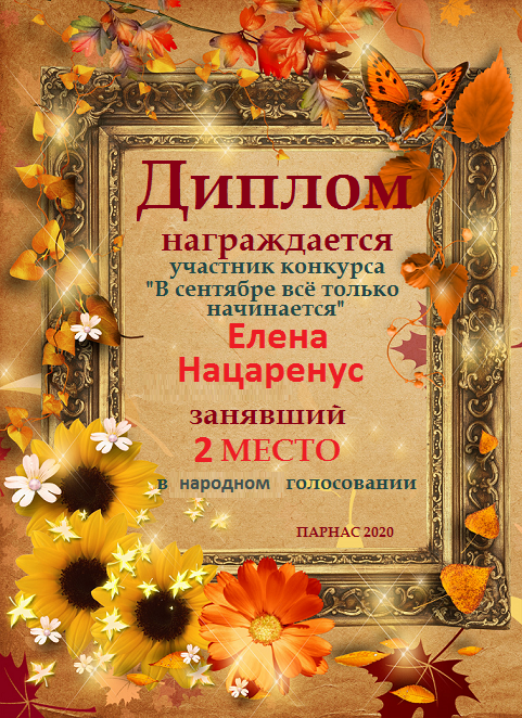 Диплом за 3 место в конкурсе авторского стиха №2 под названием "У каждого есть в жизни Берег Детства".ПОЗДРАВЛЯЕМ!