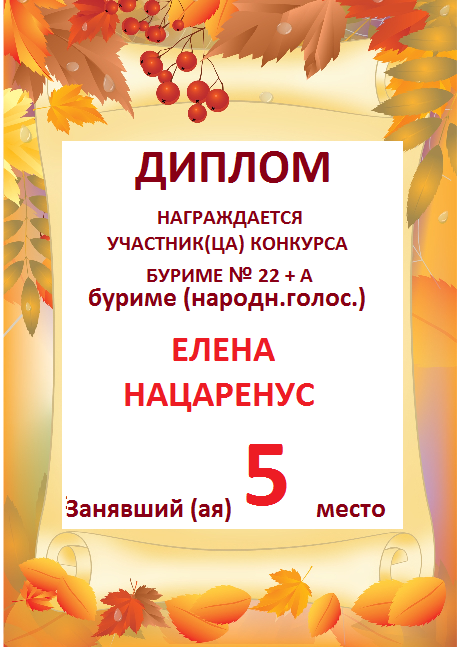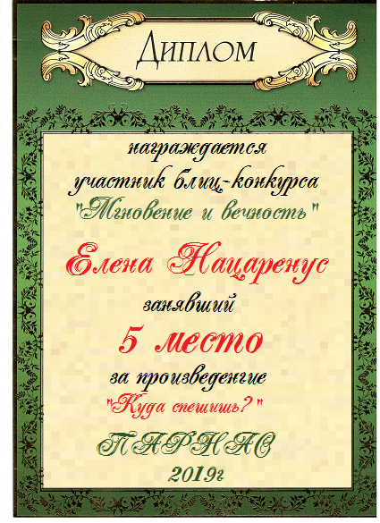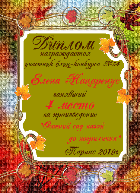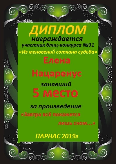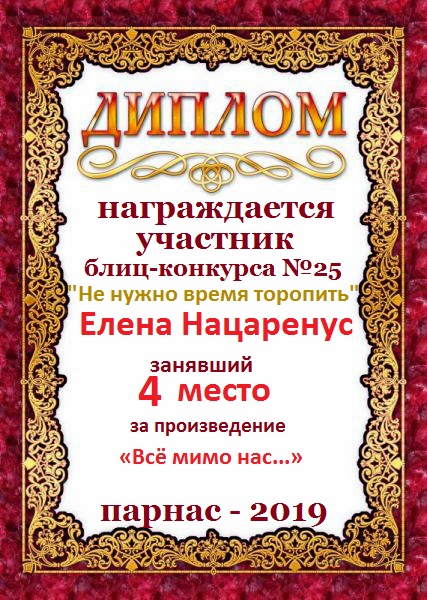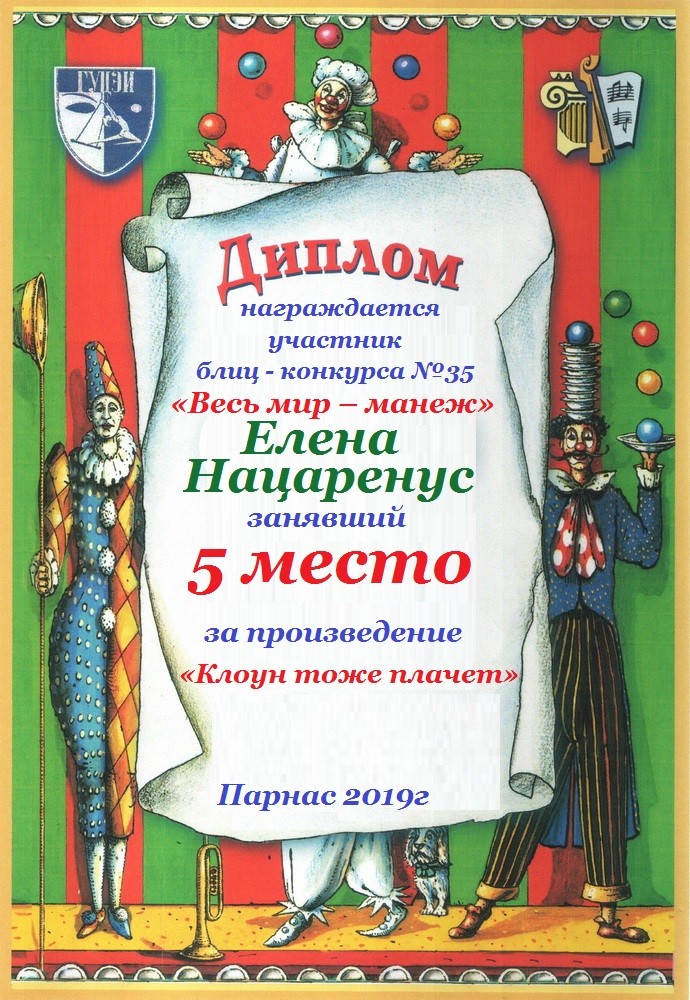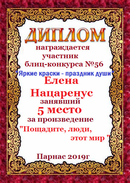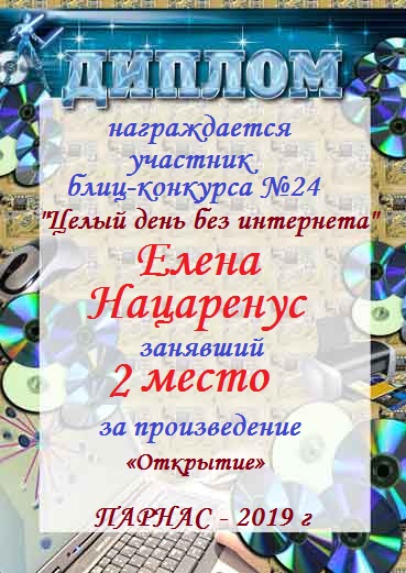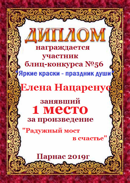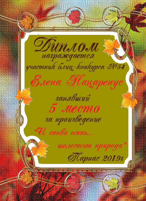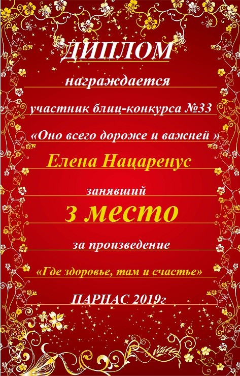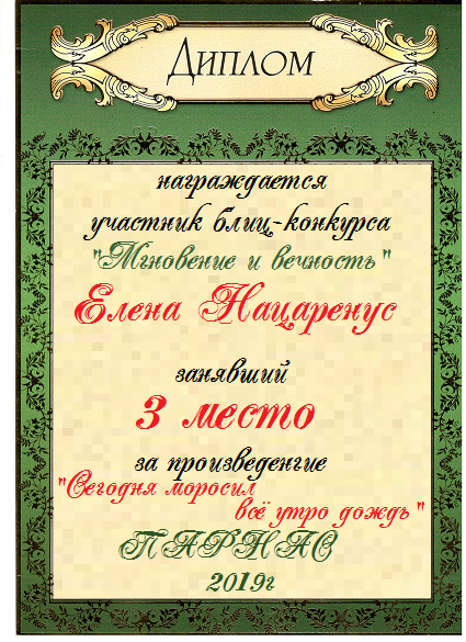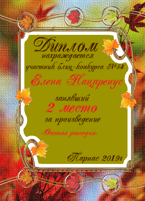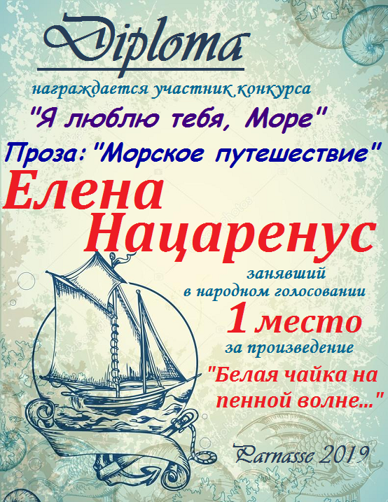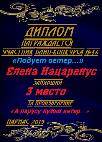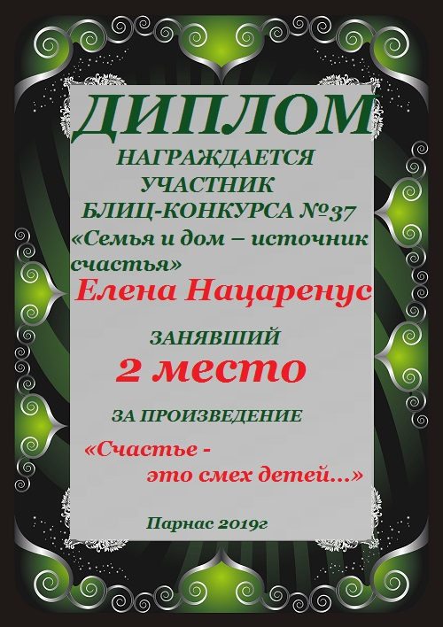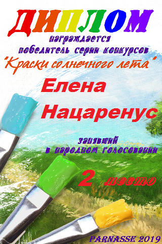 Диплом за 3 место в конкурсе авторского стиха №2 под названием "У каждого есть в жизни Берег Детства".ПОЗДРАВЛЯЕМ!