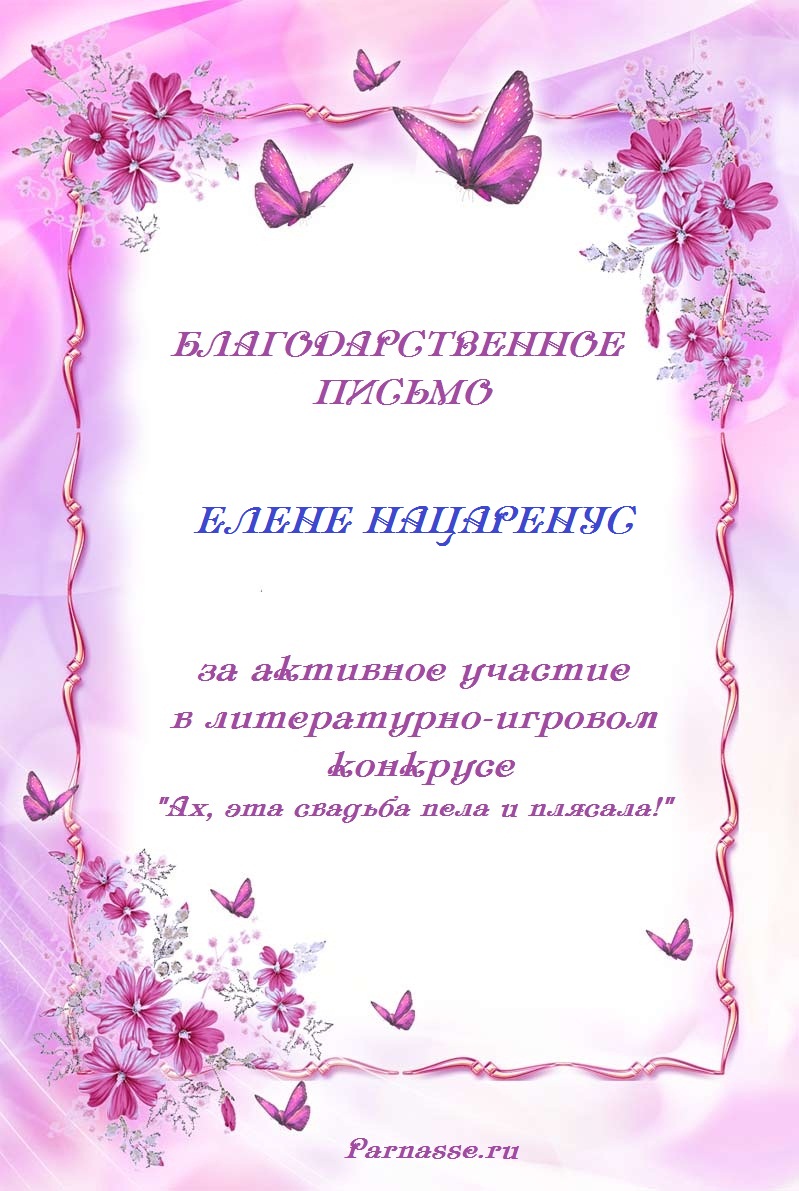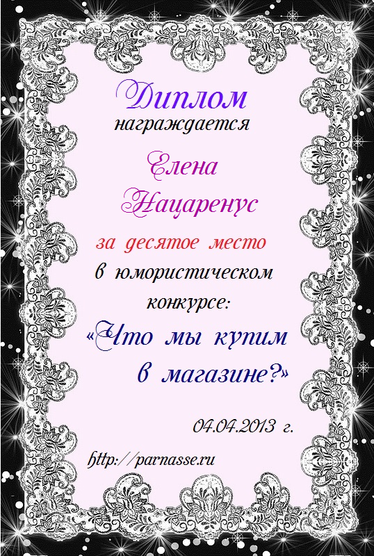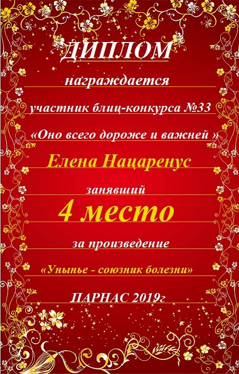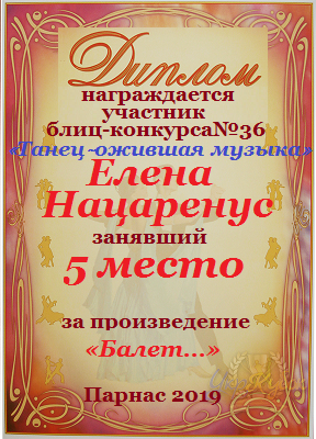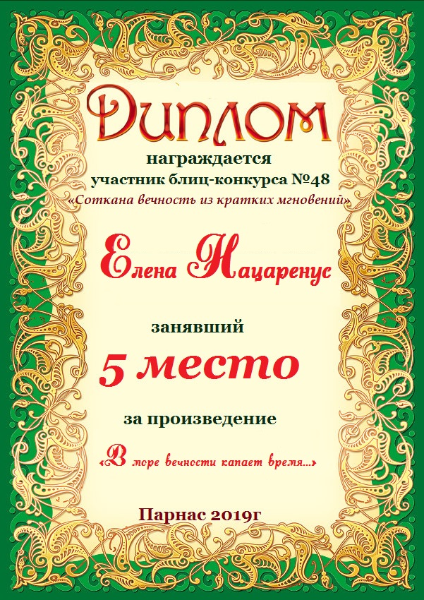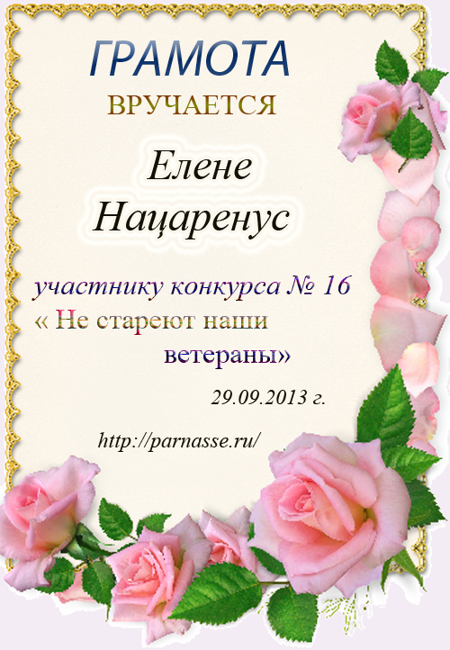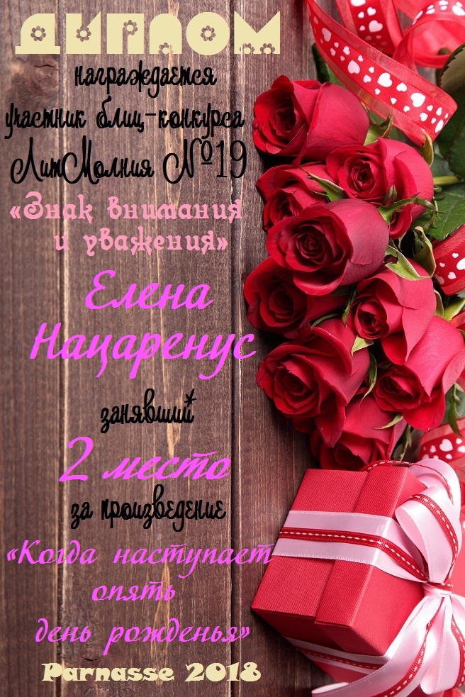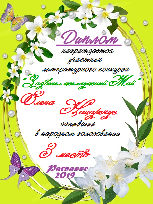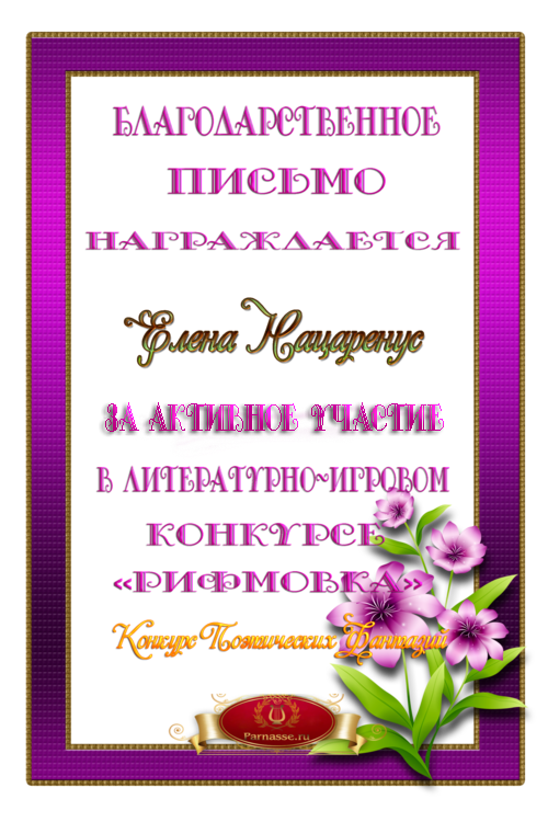 За неугасающую и неисчерпаемую творческую активность, постоянный контакт с Музой и признание сообществом "Парнасцев".От всей души желаем Вам, Елена, здоровья, любви, успехов, благополучия, удачи и творческого вдохновения!