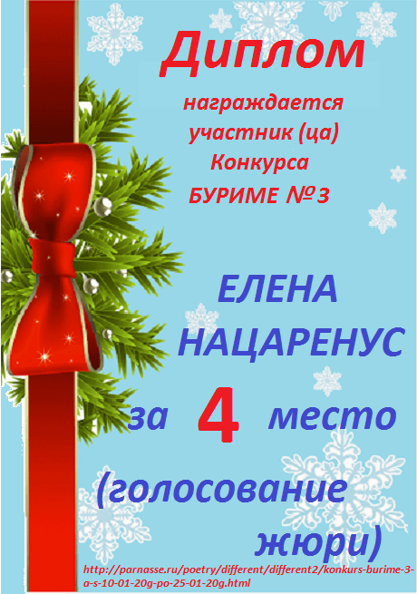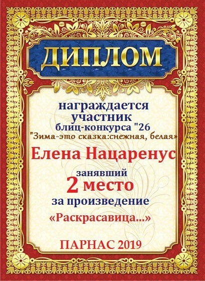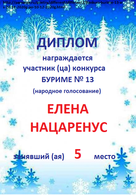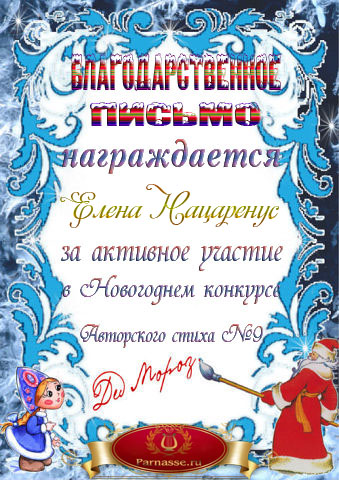 За яркое участие в конкурсе "Последнее послание зимы". Спасибо за прекрасный конкурсный стих. Желаем отличного настроения, вдохновения и ждём с нетерпением Ваши чудесные стихотворения в новых конкурсах!
