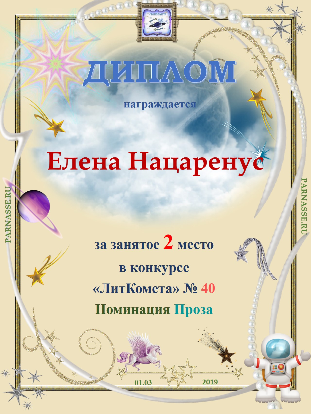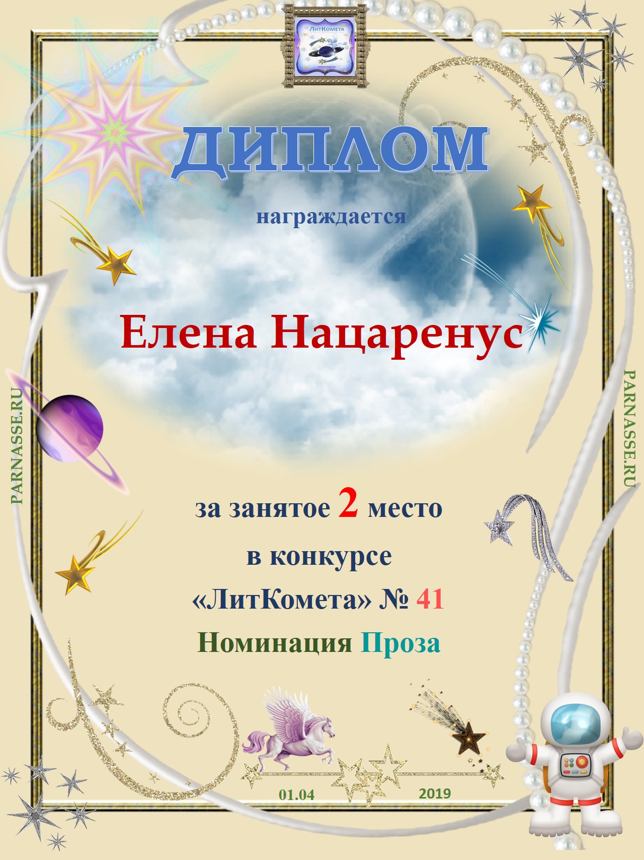 Поздравляю с занятым 1 местом в конкурсе “Литературная Комета – Полёт № 45» - Номинация Проза!