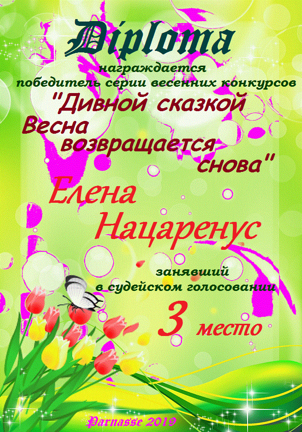 Третье место в конкурсе "Последнее послание зимы" в поэтической номинации, судейское голосование. Поздравляем с прекрасной Победой! Примите от нас искренние пожелания мира и добра, солнца, тепла и света! Улыбок друзей и заботы родных!