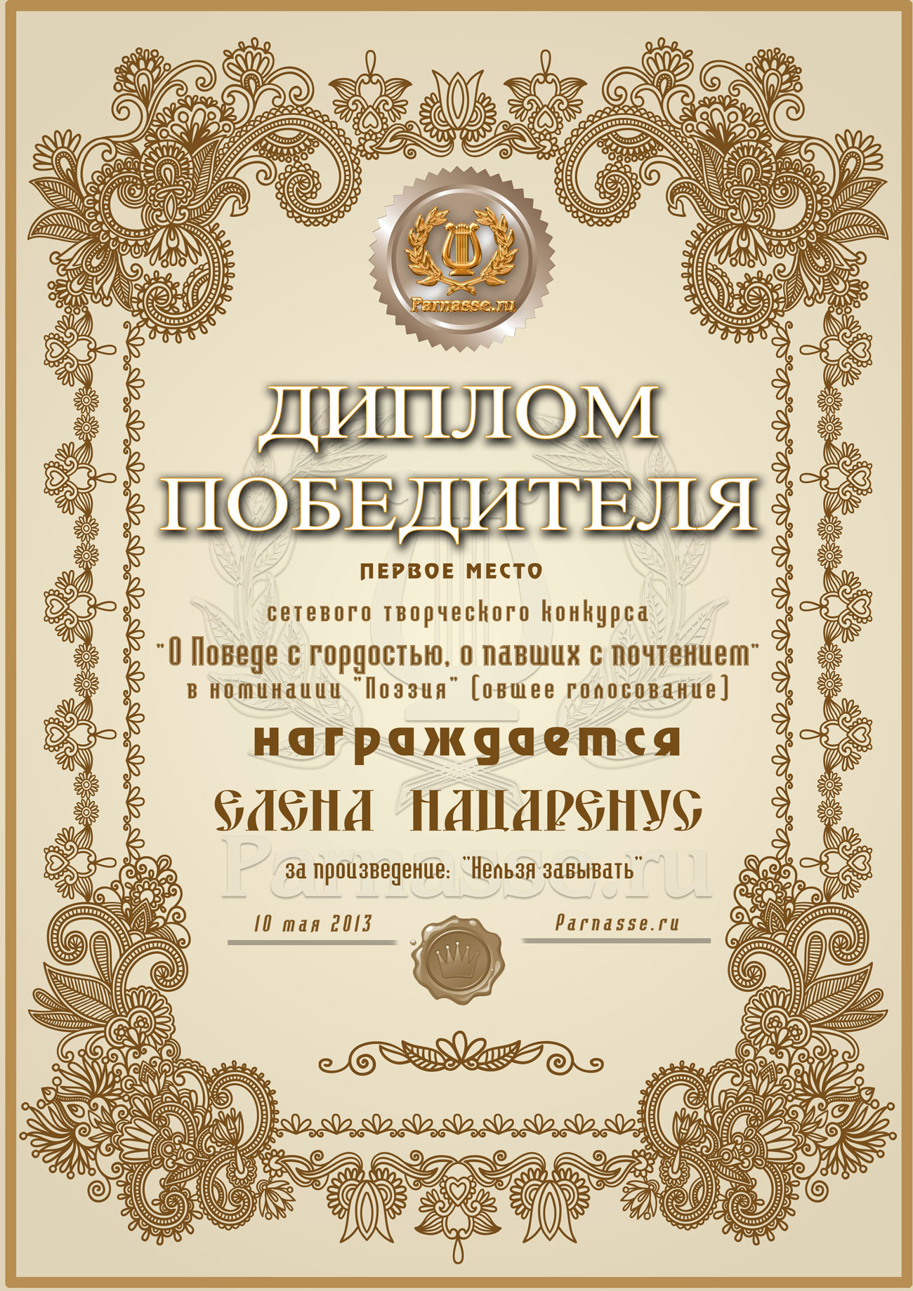 Первое место в конкурсе "О Победе с гордостью, о павших с почтением" (Общее голосование. За произведение "Нельзя забывать")