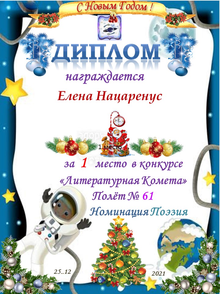 Поздравляю с занятым 1 местом в конкурсе "Литературная Комета - Полёт № 61" в Номинации Поэзия!
