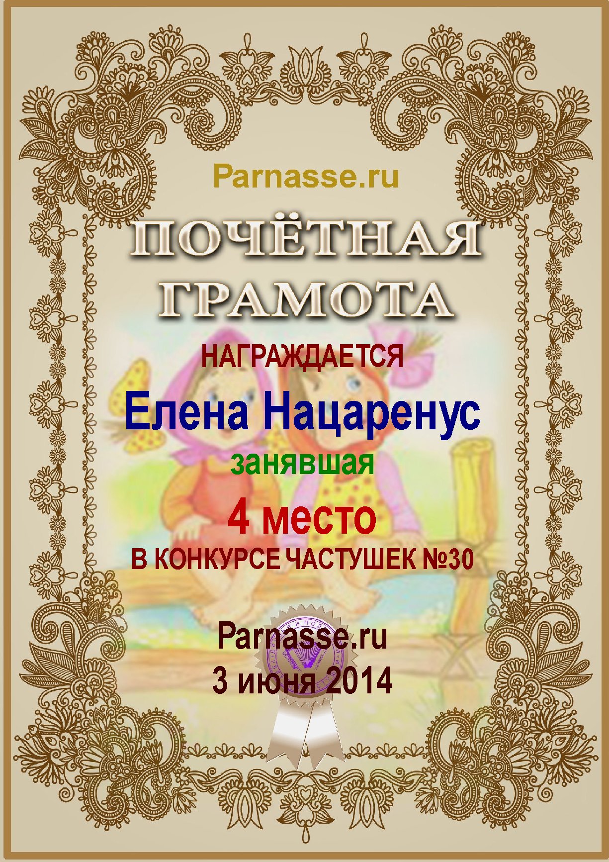 Похвальная грамота за 4 место и активное участие в конкурсе лимериков № 59+ (14.09.2014 г.)