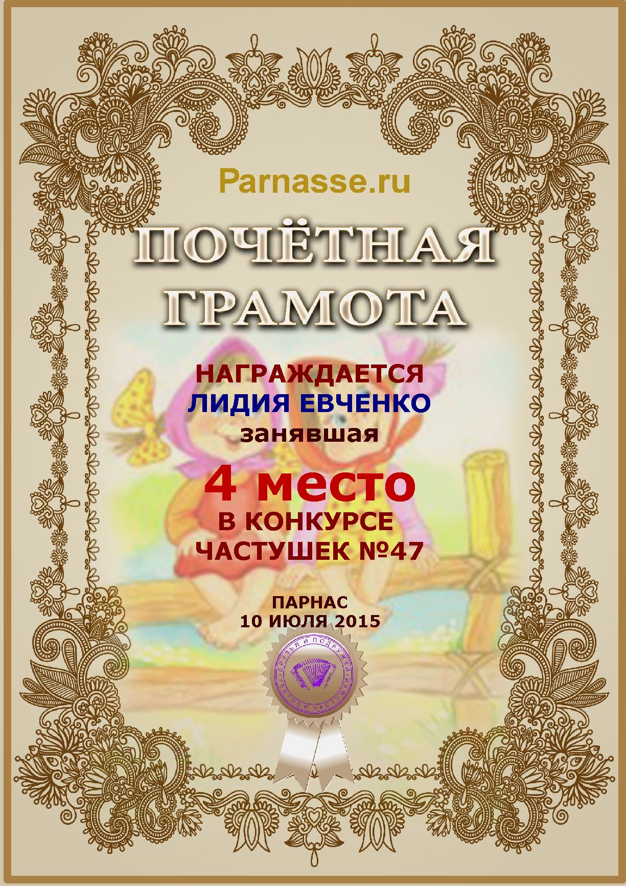 Грамота за 4е место в конкурсе частушек №47