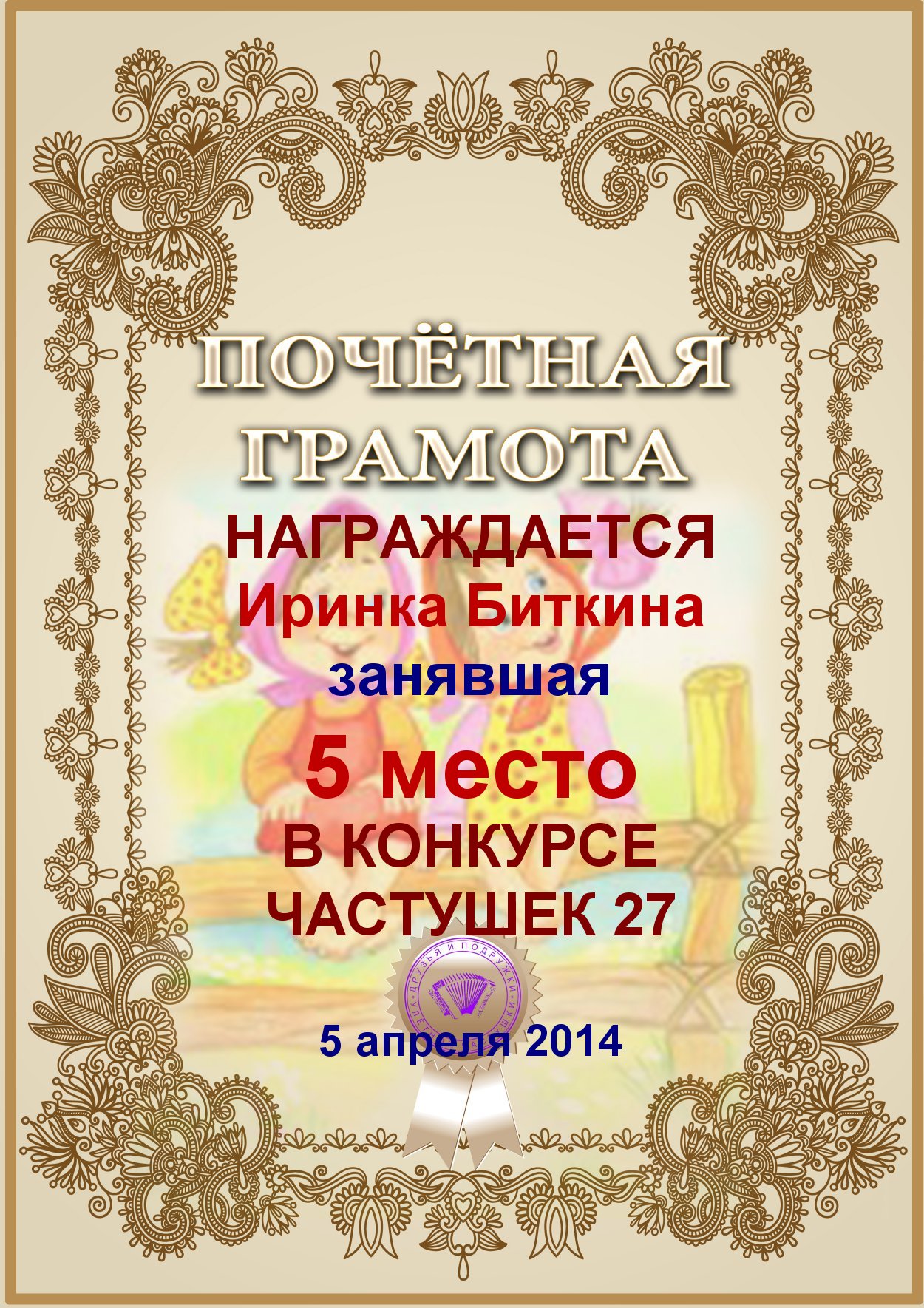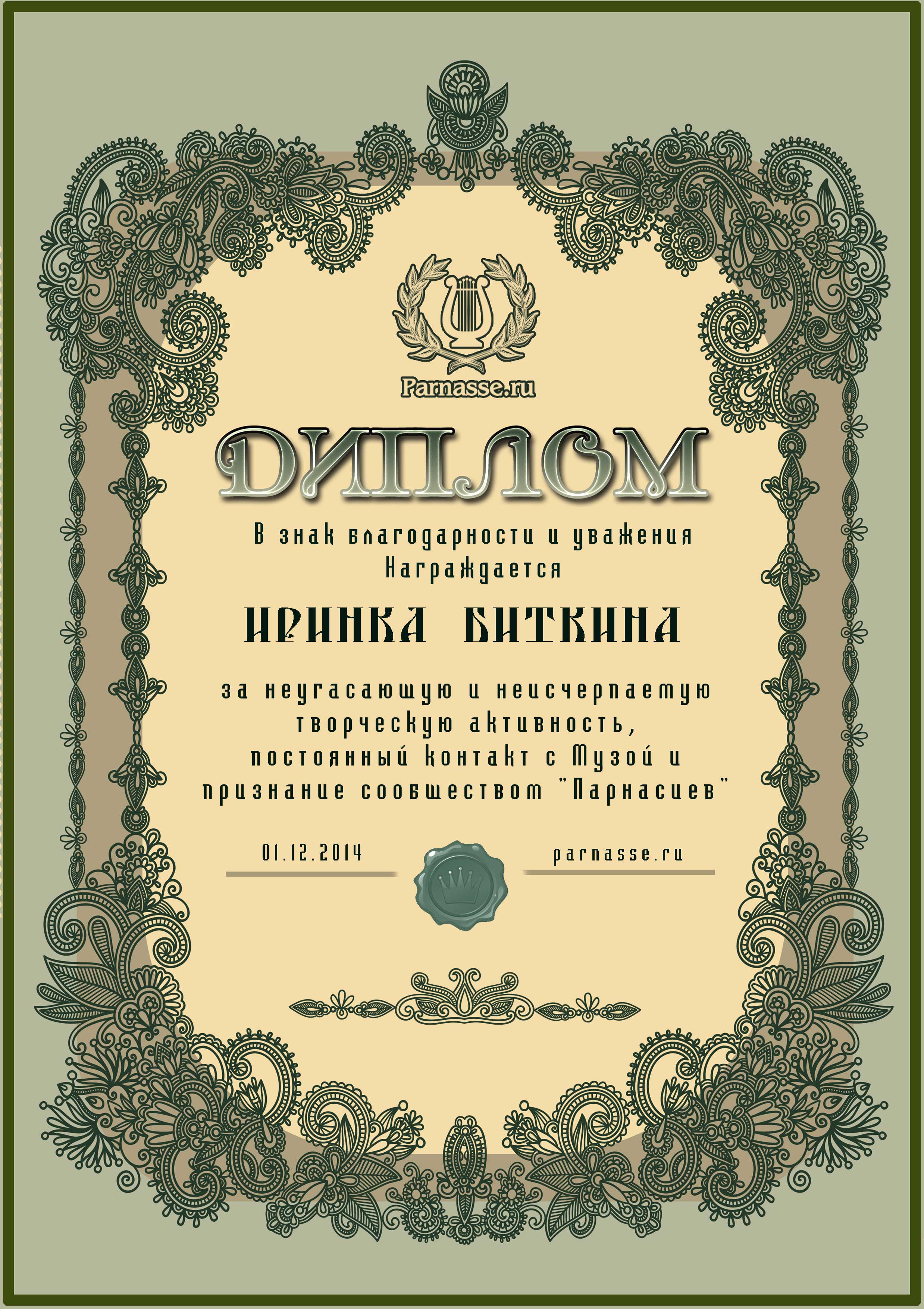 За неугасающую и неисчерпаемую творческую активность, постоянный контакт с Музой и признание сообществом "Парнасцев".От всей души желаем Вам, Иринка, здоровья, любви, успехов, благополучия, удачи и творческого вдохновения!