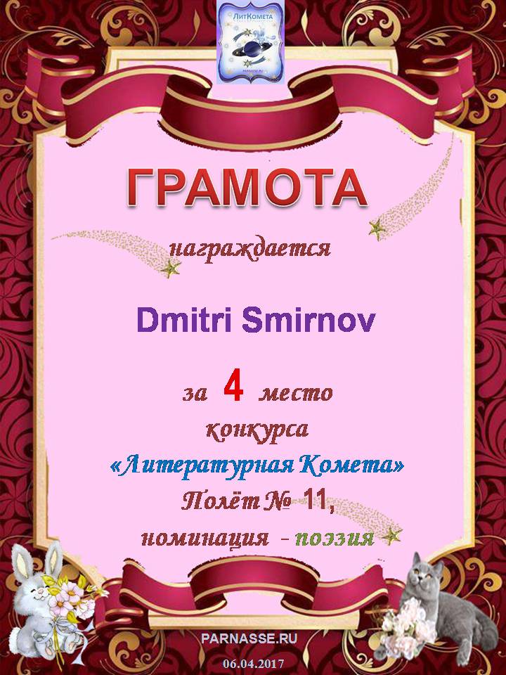 Поздравляю с занятым 4 местом в конкурсе "ЛитКомета - Полёт № 56" - Номинация Поэзия!
