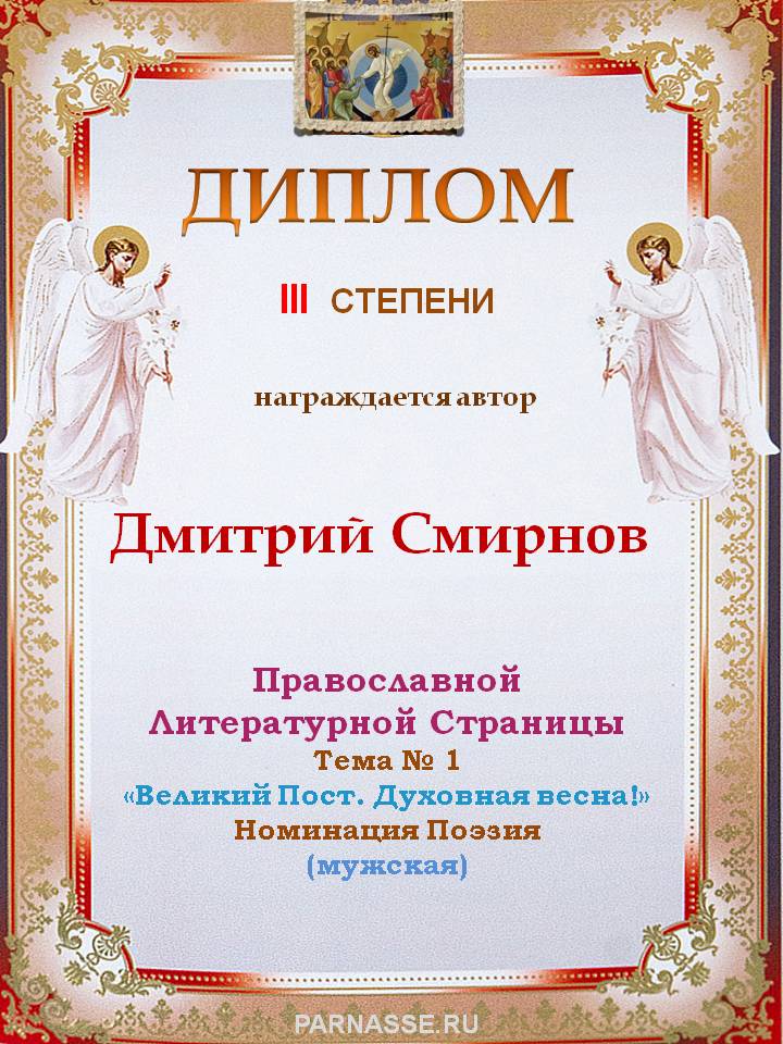 За 4-е место на Православной Литературной Странице, Тема № 1 "Великий Пост. Духовная весна!" Номинация Поэзия.