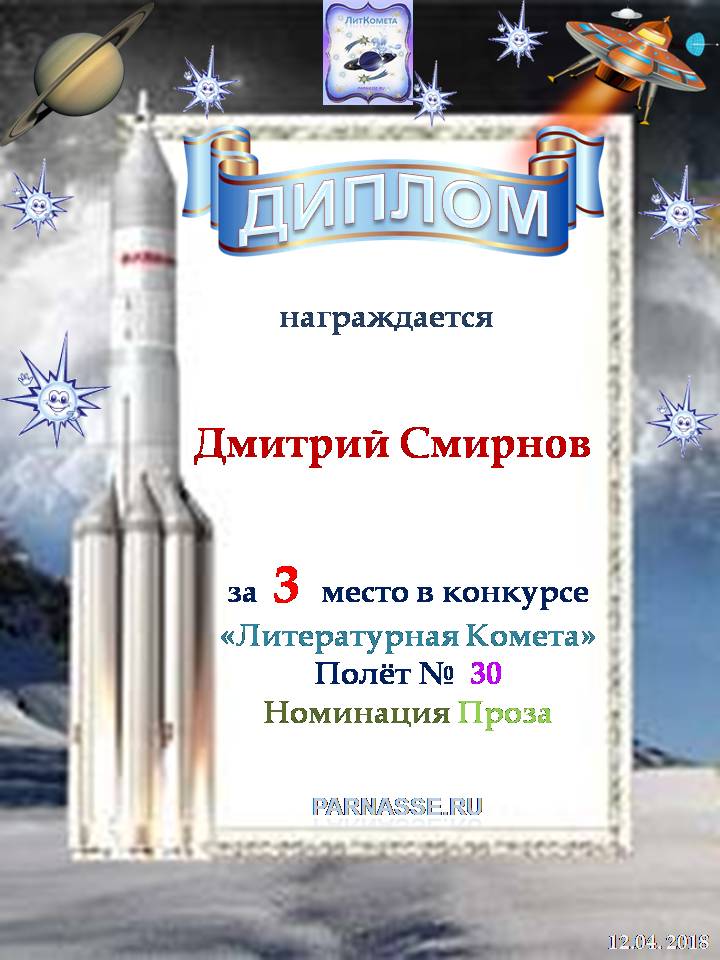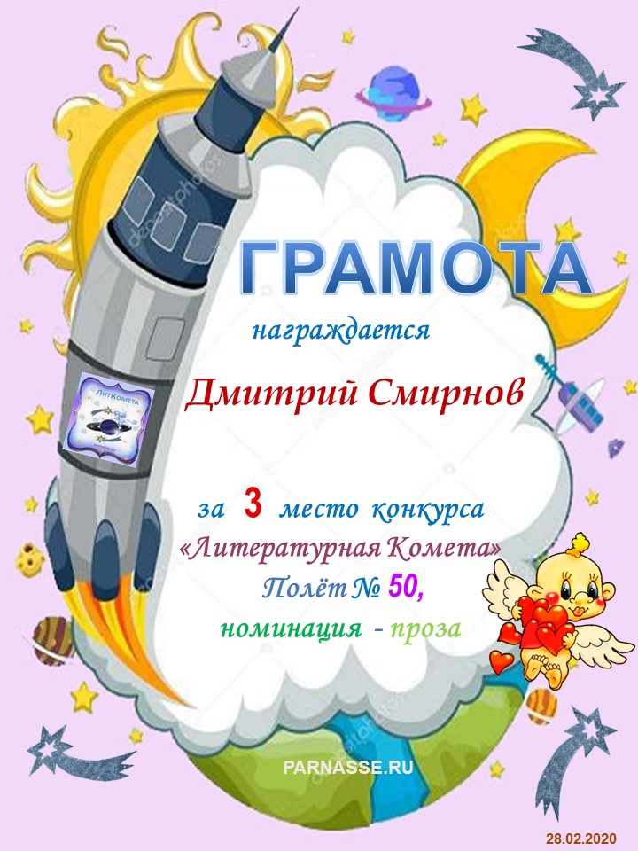 Поздравляю с занятым 3 местом в конкурсе "Литературная Комета - Полёт № 50" - Номинация Проза!