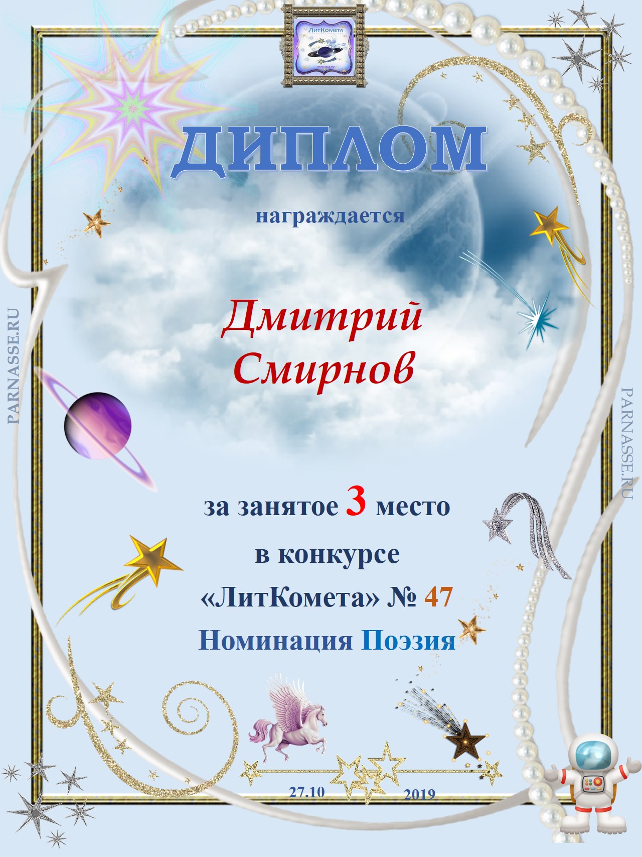 Поздравляю с занятым 3 местом в конкурсе "Литературная Комета - Полёт № 47" - Номинация Поэзия!