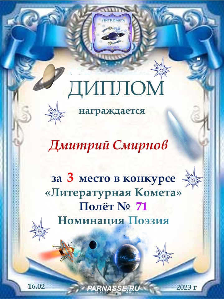 Поздравляю с занятым 3 местом в конкурсе "ЛитКомета-Полёт № 71" - Номинация Поэзия!