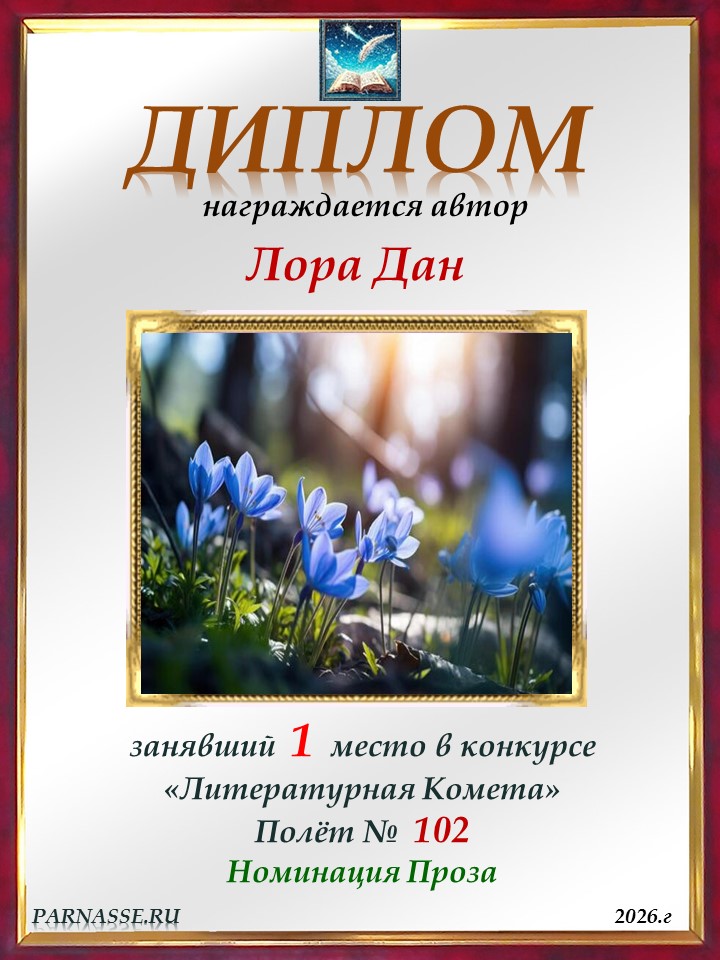 Поздравляю с занятым 1 местом в конкурсе "Литературная Комета - Полёт № 61" в Номинации Проза!
