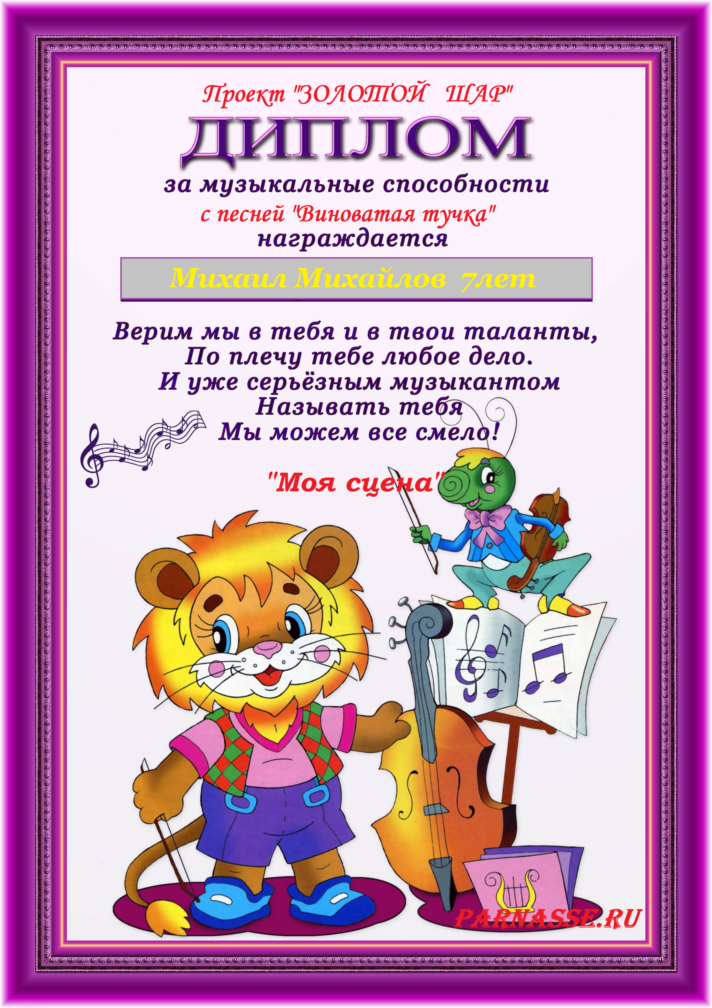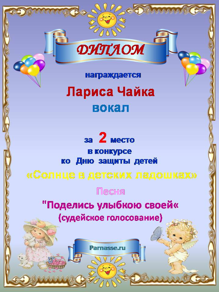 За второе место в конкурсе, посвященном Дню защиты детей. Судейское голосование. Песенная Номинация "Поделись улыбкою своей". Исполнитель прекрасной песни "С Днём Рождения, Февралька!". Поздравляем с великолепной, заслуженной победой!