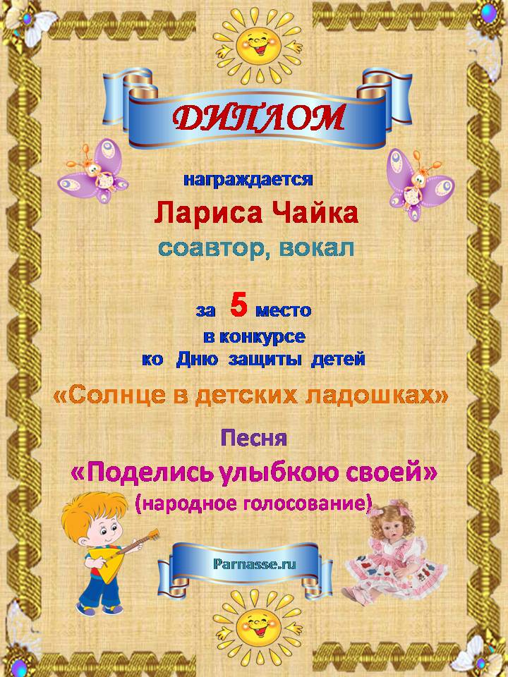 За пятое место в конкурсе, посвященном Дню защиты детей. Народное голосование. Песенная Номинация "Поделись улыбкою своей". Великолепное сопровождение чудесной песни "С Днём Рождения, Февралька!". Поздравляем с прекрасной победой.