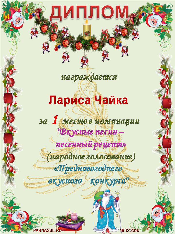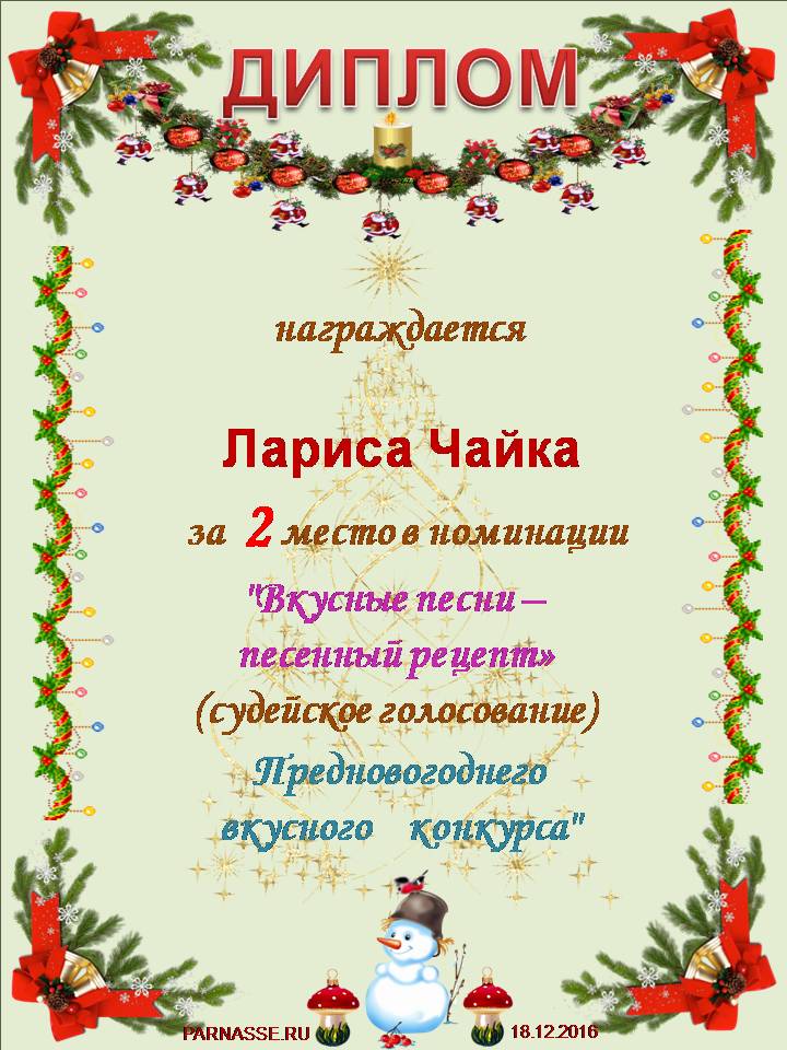 Второе место в музыкально-литературном конкурсе "Предновогодний Вкусный" в песенной номинации "Вкусные песни - песенный рецепт", судейское голосование. Поздравляем с красивой победой. Благодарим Вас, Лариса, за восхитительное исполнение прекрасной песни "Салат "Новогодняя ночь"". От всей души поздравляем Вас с наступающим Новым 2017 Годом! Счастья и радости, здравия и всех благ, удачи на все года! Спасибо Вам за душевные песни!