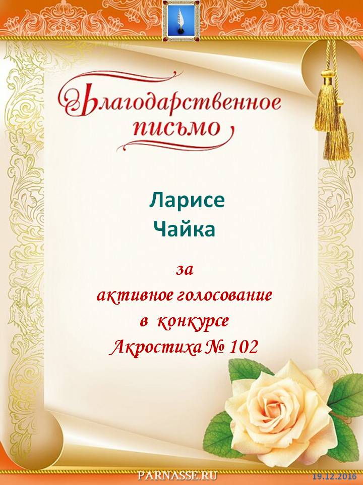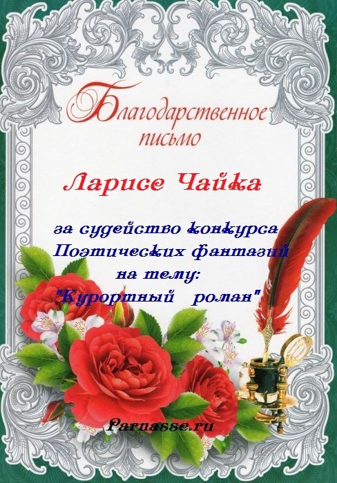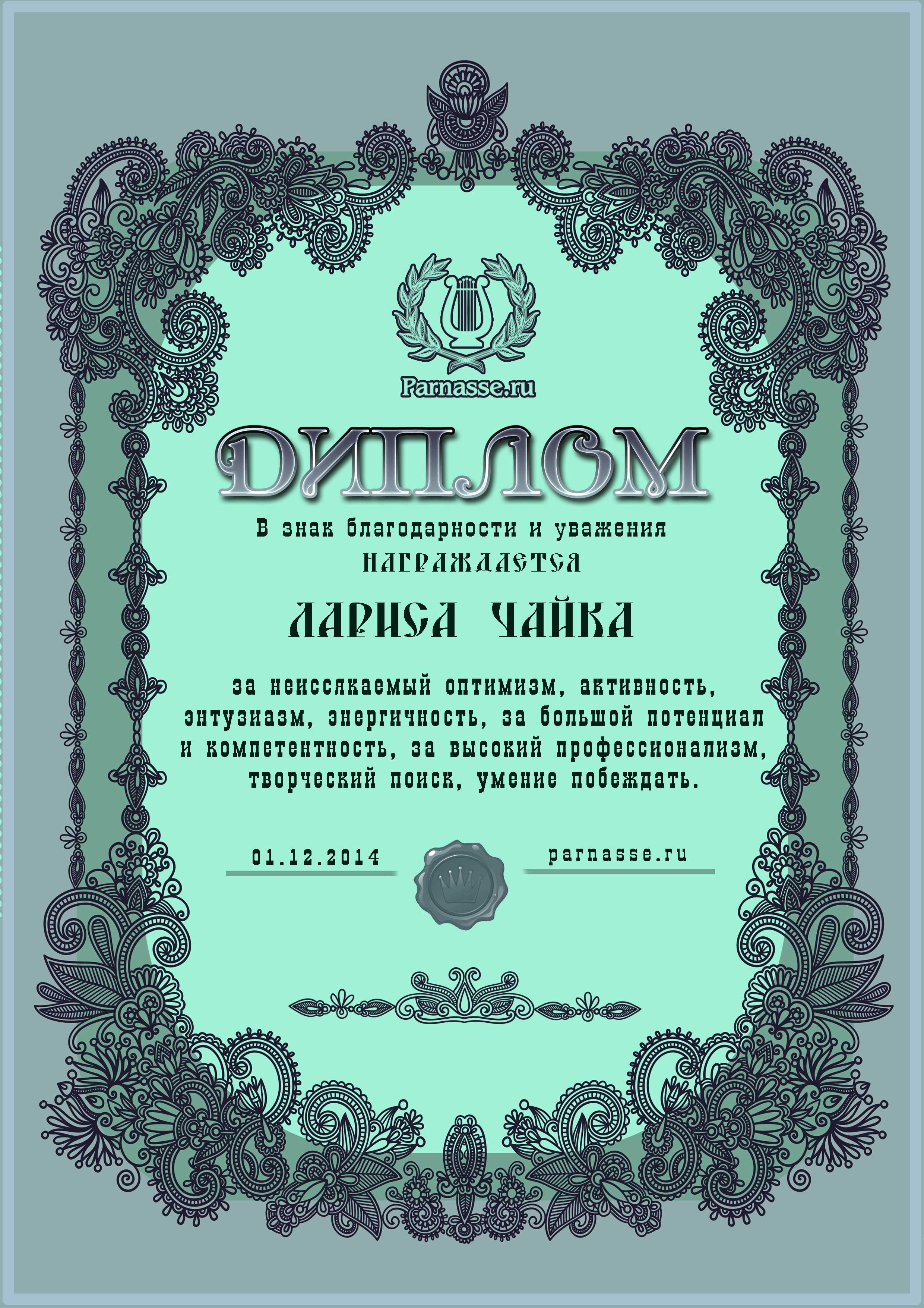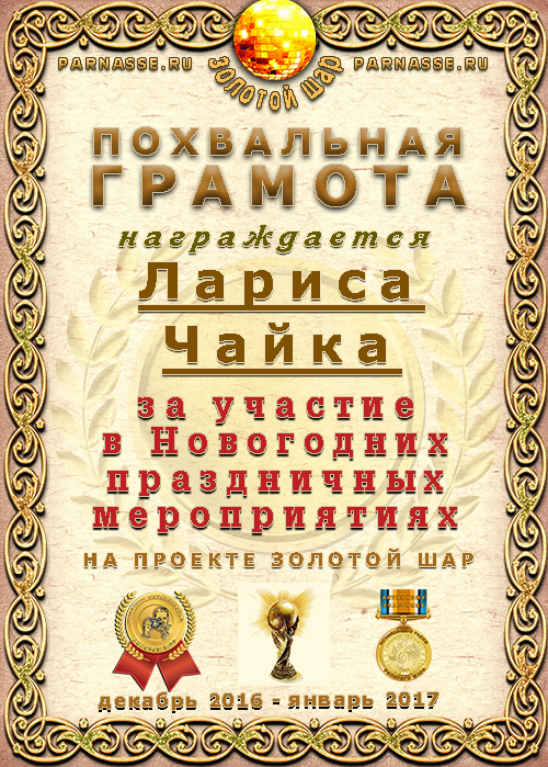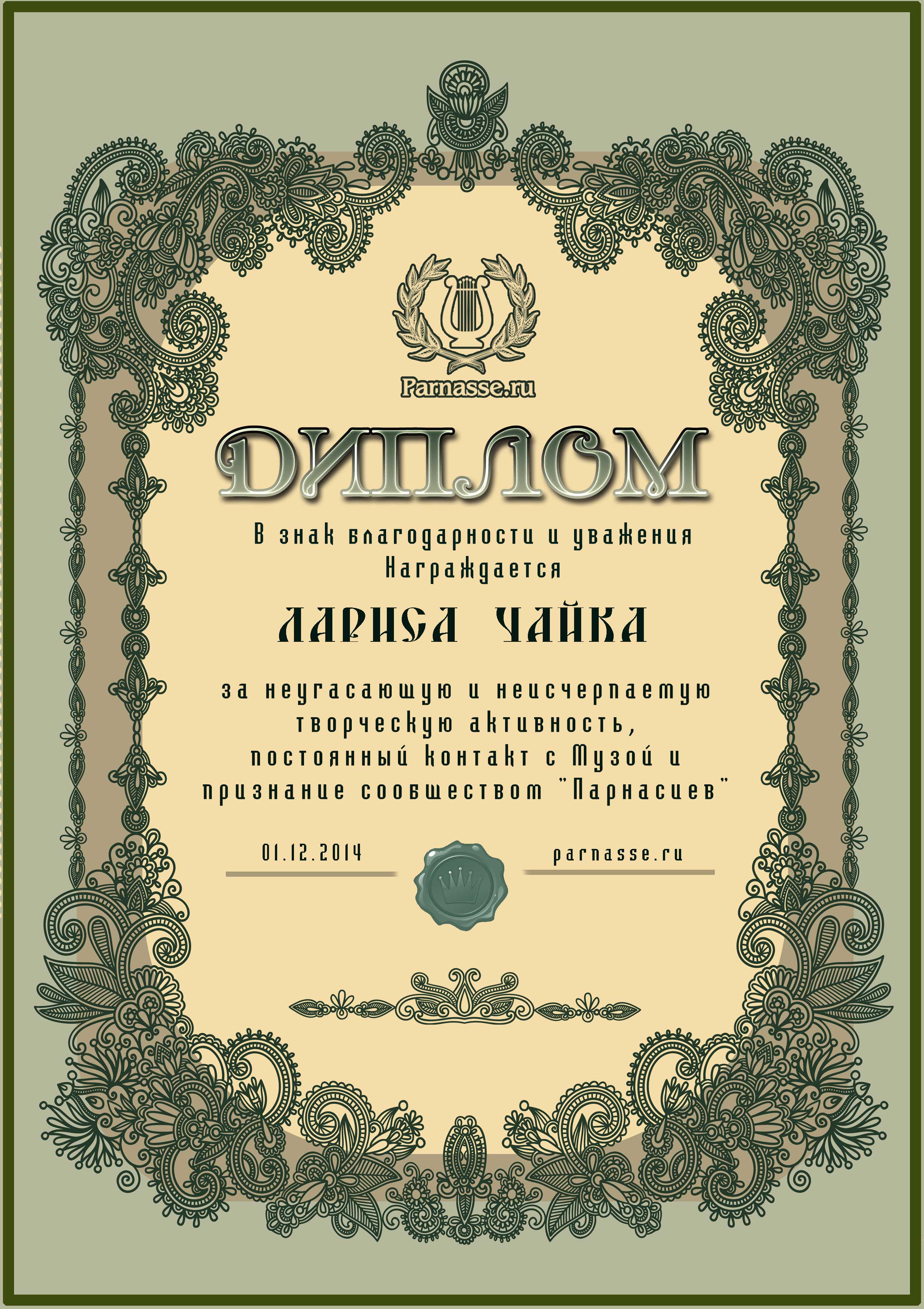 За неугасающую и неисчерпаемую творческую активность, постоянный контакт с Музой и признание сообществом "Парнасцев".От всей души желаем Вам, Лариса, здоровья, любви, успехов, благополучия, удачи и творческого вдохновения!